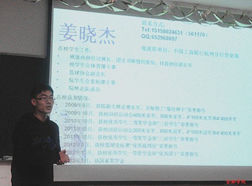 “职”点江山系列活动之求职就业讲座在学院楼202教室准时举行。本次活动有幸邀请到就职于中国建设银行杭州支行、杭州联合银行和中国工商银行杭州支行的余谦学长、叶片翩学姐和姜晓杰学长。他们带着精彩纷呈的求职经历与同学们亲切交流,为同学们的实习就业提供许多宝贵的建议。