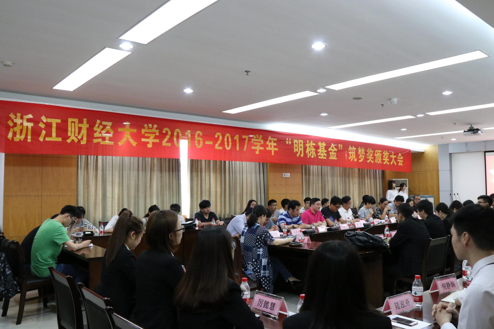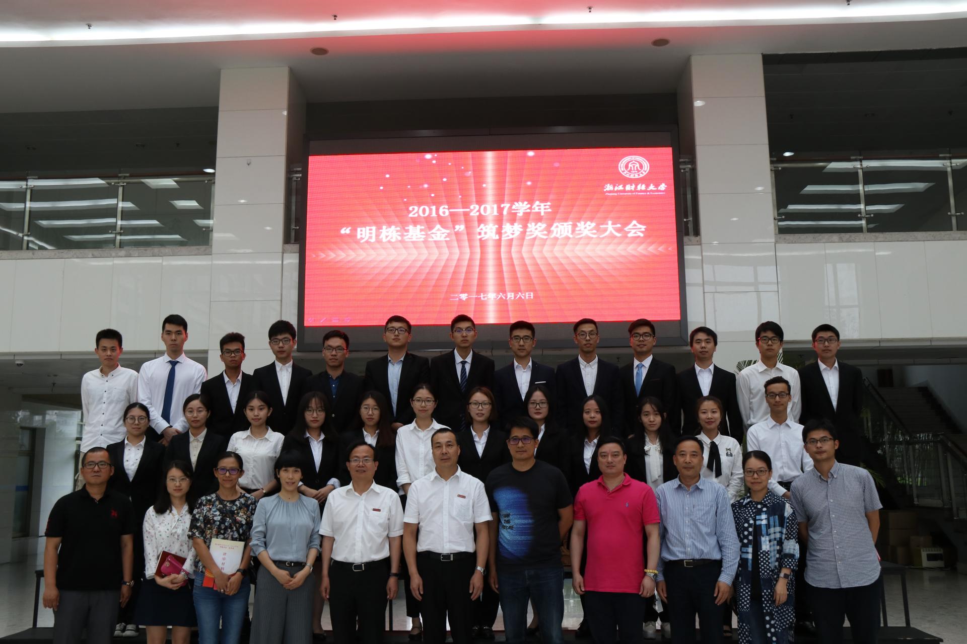 2016-2017学年“明栋基金”筑梦奖颁奖大会在行政楼200隆重举行。浙江盈阳资产管理股份有限公司总裁楼栋、蓝山投资有限公司总裁王柳琳、浙江盈阳资产管理股份有限公司总经理孔繁岗、关瑞慈善基金会执行会长吕霞、水果派