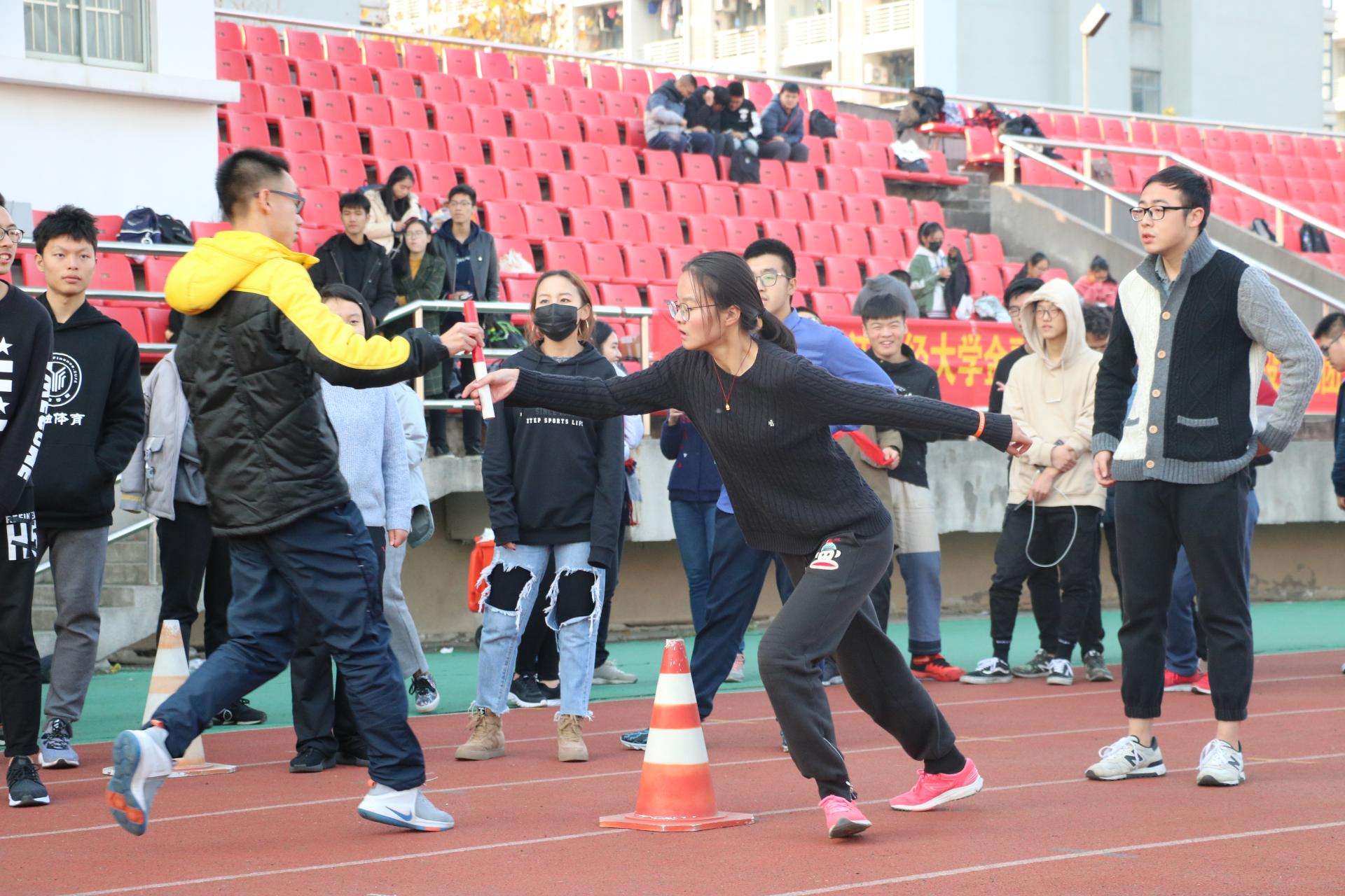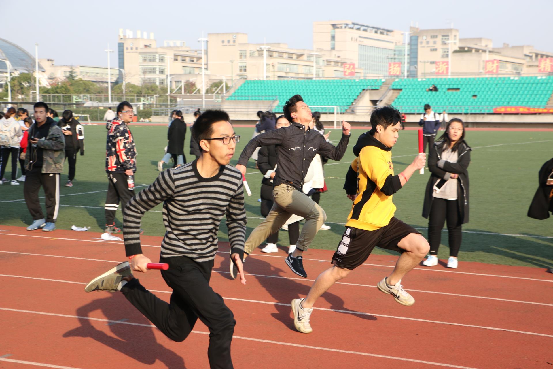 接下来的比赛是八男八女的16*50米迎面接力。运动员们为了班级与团队的荣誉,奋力地挥舞着手中红色的交接棒,都拼劲全力奔跑。而跑道两旁的观众发出阵阵喝彩声,为他们加油呐喊。经过激烈的角逐,17金融2班,17金融1班,15中英金融2班分别获得了冠亚季军。