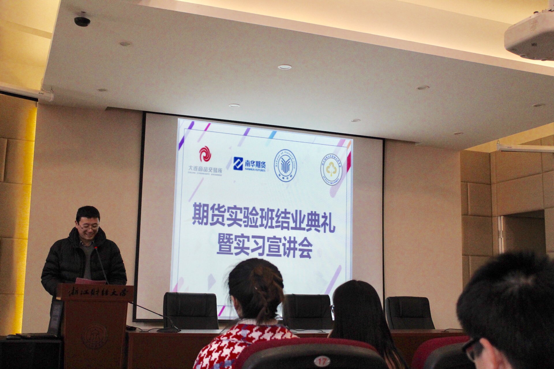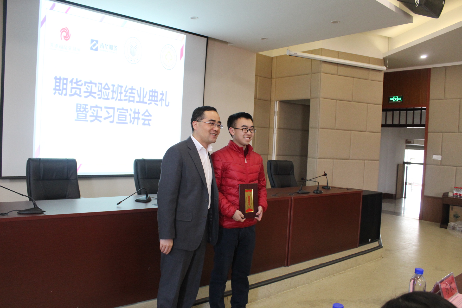 副院长王聪聪上台致辞,总结了此次活动,并分享了今后的展望。南华期货人力资源总监孙权先生致辞,表达了对实验班学员的高度赞扬及鼓励。随后,南华期货代表为优秀学员颁奖:郑豪同学获一等奖,奖金八千元;赵新宇等两名同学获二等奖,奖金两千元;闫高伟等三名同学获三等奖,奖金一千元;另有10名同学获得优秀奖,奖金五百元。