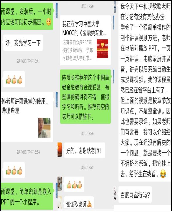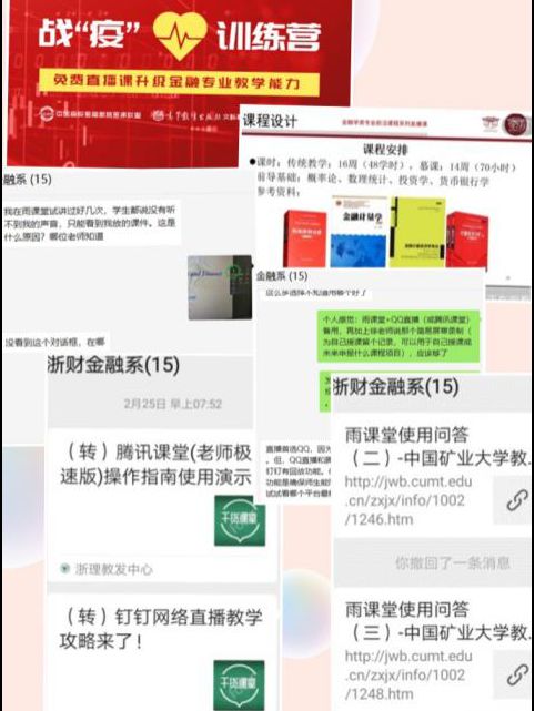 兵马未动,粮草先行。各类直播平台、软件的选择和使用是确保在线教学效果的关键一环。学院的老师们积极探索,克服困难,进行了多种尝试并及时共享心得。金融工程系的王聪聪教授针对《Investments》课程,总结和共享了“钉钉直播+OneNote”结合的在线教学使用心得。信用管理系的张超副教授针对《金融数据挖掘》实验课程的特点,分享了“雨课堂+QQ课堂+PPT录屏结合”的教学方式。保险与精算系的张代军教授结合《保险经营管理学》就如何用好浙江省高等学校在线开放课程共享平台和老师们进行了细致的分享。投资系的阎晓春副教授分享了“钉钉+《信托与租赁》慕课+雨课堂”的教学方法,其中《信托与租赁》慕课被中南大学、南京审计大学、四川农业大学等多家外省市高校异步或同步引用。金融学系的鲁莹博士针对《国际金融》课程的特点,探索和共享了“省在线平台+腾讯课堂”的在线教学方案。同时,阎老师和鲁老师的这两门课程在刚刚落幕的浙江省本科院校“互联网+教学”优秀案例(线上线下混合课程)的评选中喜获省二等奖,更是为线上教学的开展增添了力量。