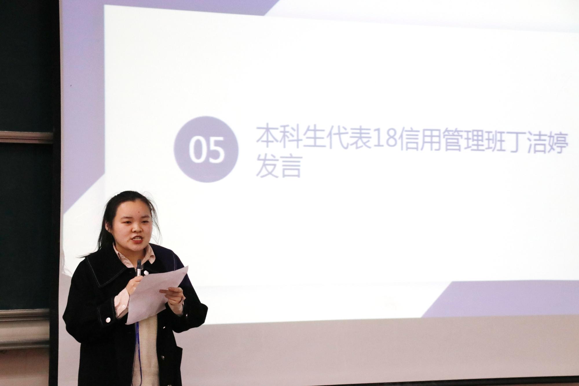 研究生代表19金融1班温从乐分享了自己的考研经验,他认为备考不仅要踏实“温故”,还要要勤奋“知新”,同时也要缓解焦虑情绪,放平心态。他表示研究生们定会认真履行考研“摆渡人”的职责,努力把学弟学妹们“渡”上岸。本科生代表18信用管理班丁洁婷对“研本共建”项目表示了感谢和期待,希望明年此时,大家都成功升级为研究生。