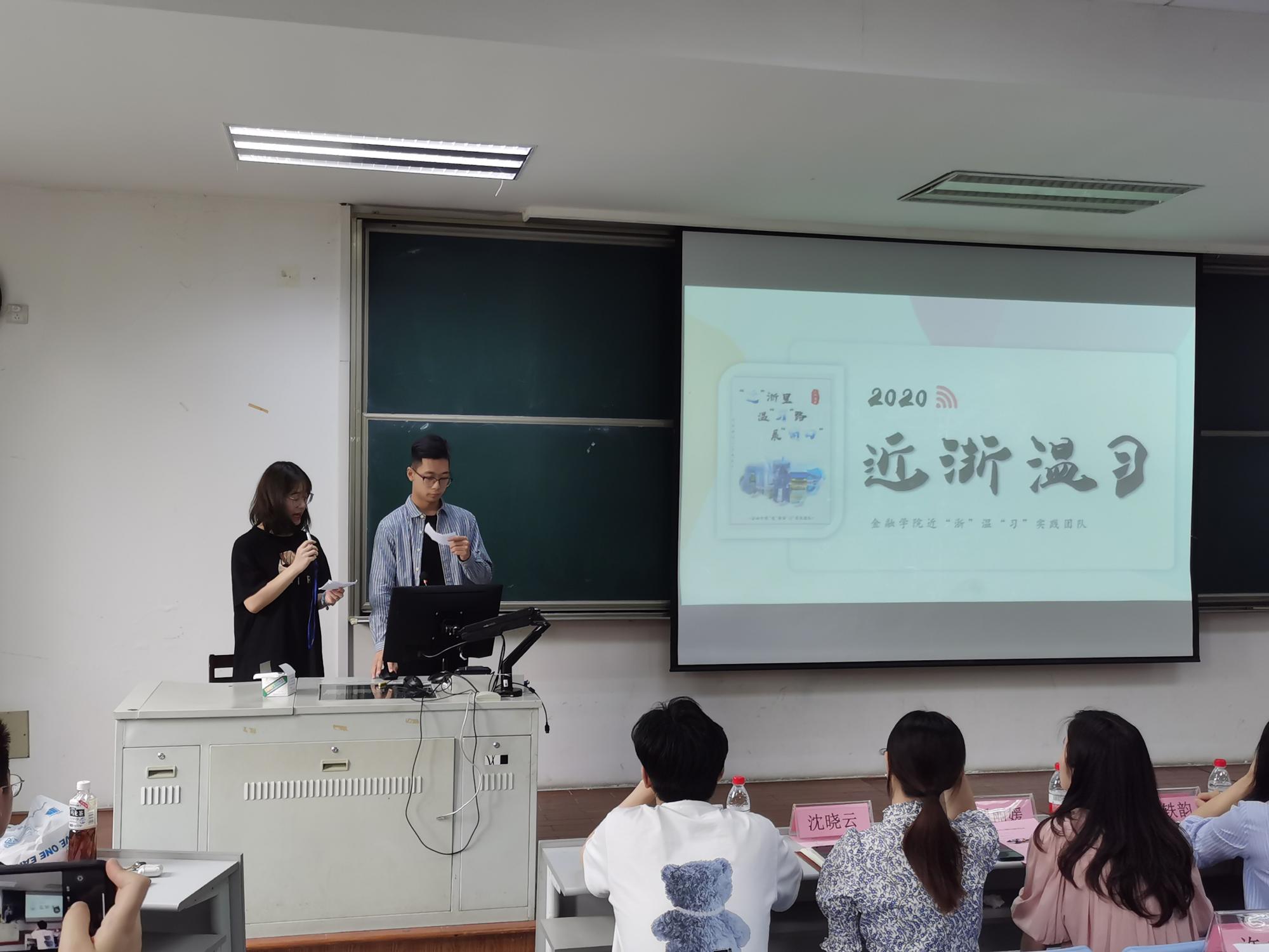 “近”浙温“习”实践团队曾获2020年浙江工商大学暑期社会实践“十佳团队”,团队代表陈家瑶和金康迅向同学们分享了自己的实践项目和实践心得。团队重温习近平总书记任职浙江期间对各地发展提出的要求与期望,感知浙江“干在实处、走在前列、勇立潮头”的改革之路,为同学们的实践活动选题提供了新思路和新视角。