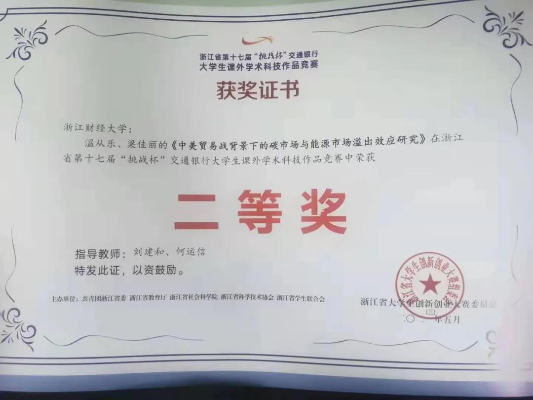 其中由刘建和、何运信老师指导,温从乐、梁佳丽参加的《中美贸易战背景下的碳市场与能源市场溢出效应研究》荣获浙江省第十七届“挑战杯”大学生课外学术科技作品竞赛二等奖。