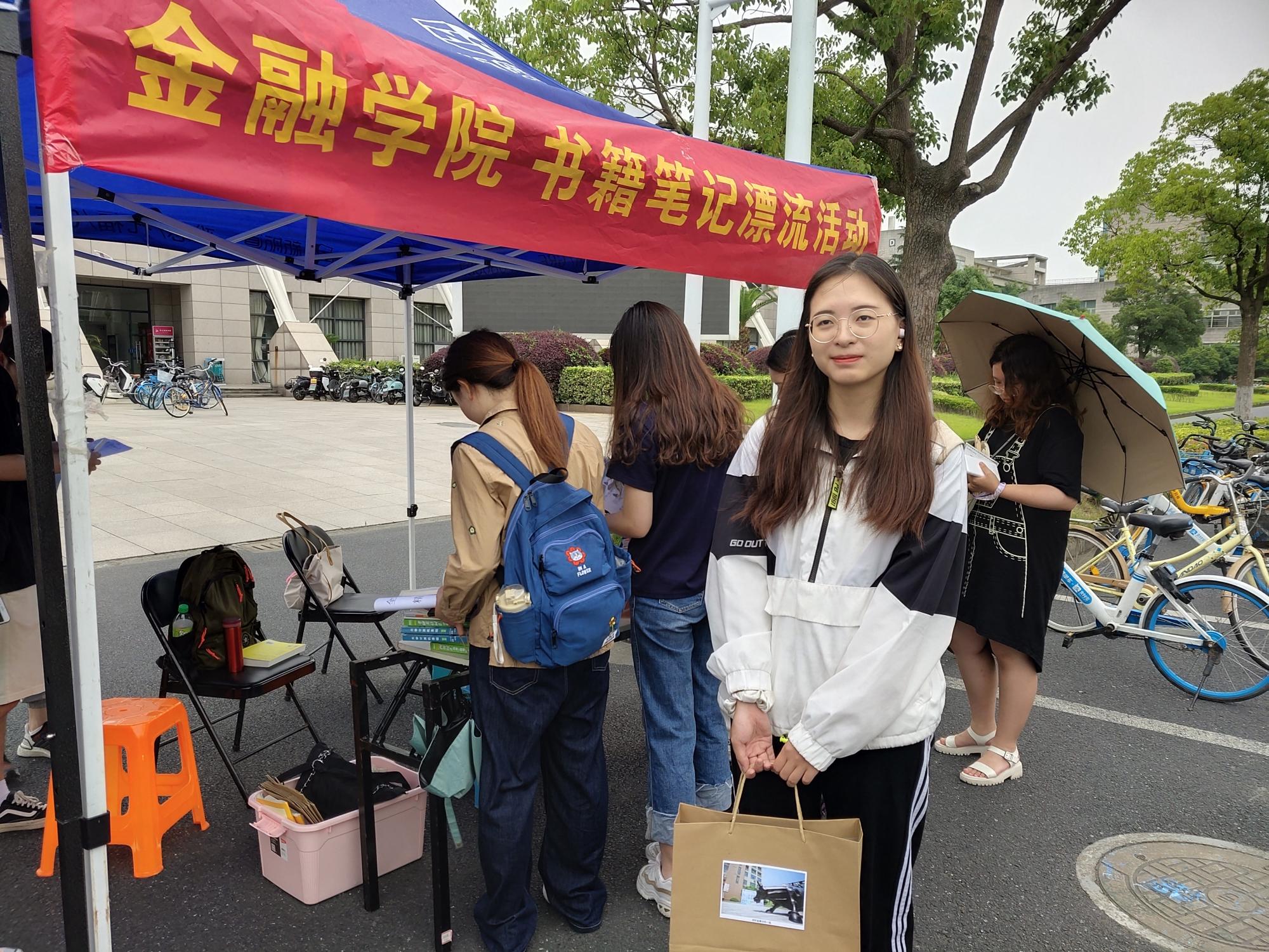 毕业生捐赠的书籍笔记在整理分类后,经文化长廊“漂流站”,“漂流”到低年级同学手中。一时间,金融学子的“朋友圈”中“送书暖后辈”“领书祝前辈”蔚然成风。旧书蕴真情,一本本书籍成为了毕业生和学弟学妹们沟通的桥梁,真正实现物尽其用、资源节约。
