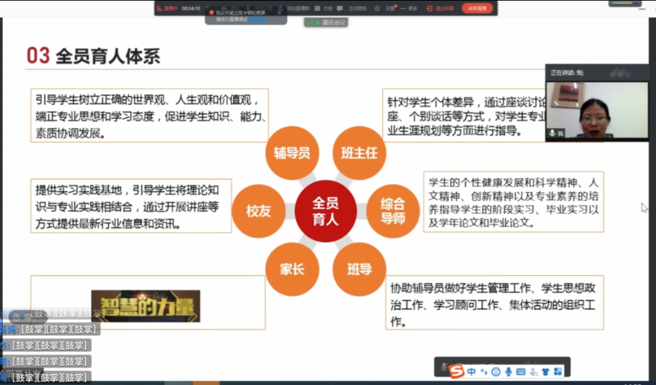 谢敏副书记介绍了学院学生管理工作。学院积极贯彻“全员育人”的教育理念,辅导员、班主任、综合导师、家长、班导、校友在学生健康成长中均发挥了重要作用。她还介绍了水果派