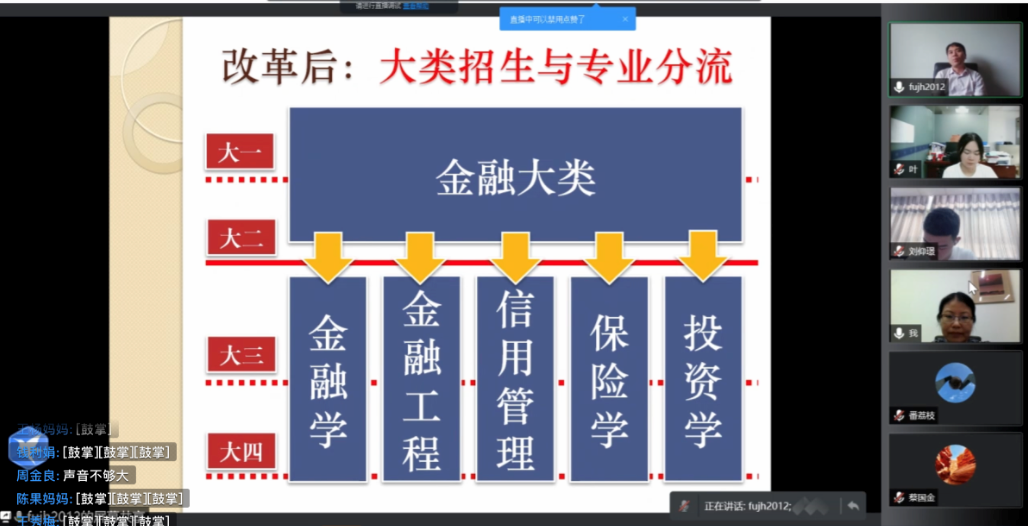 分管教学副院长傅俊辉介绍了学院人才培养方案和CFA项目。他向全体新生和家长介绍了改革后的大类招生与专业分流,详细介绍了四年学习生涯的课程规划与大类专业特色,强调了在校期间绩点的重要性,并从“终身学习意识”、“身体锻炼意识”、“职业底线意识”三个意识,特色鲜明地阐述了学院的培养角度及对同学们的期待。此外,傅院长还介绍了水果派