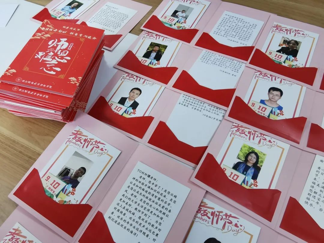 早在一周前,团委学生会便开始向全校同学征集献给老师们的祝语,短短几天就收到百余条留言,感情真挚的字里行间无不透露着对浓浓师恩的感激之情与对老师教书育人的敬佩之意。网络宣传部在推翻了多个方案后,定下以“师恩难忘”为主题的贺卡封面,典雅大气又不失精致的细节。社团管理部和生活权益部还为每个老师都设计了专属的卡通人物形象,更体现了同学们眼中老师亲切可爱的一面。