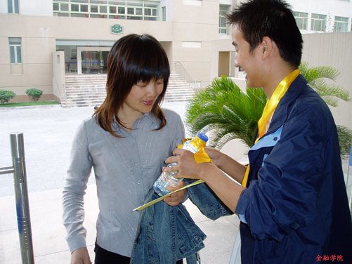 当天下午,黄丝带的队伍还来到了三号学院楼,诚挚的金融学子们也为前来工作的老师们送上了一份惊喜。“我很高兴,收到这份礼物真的很意外也很开心!”一位老师拿着系有黄丝带的水,笑着对学生们说。