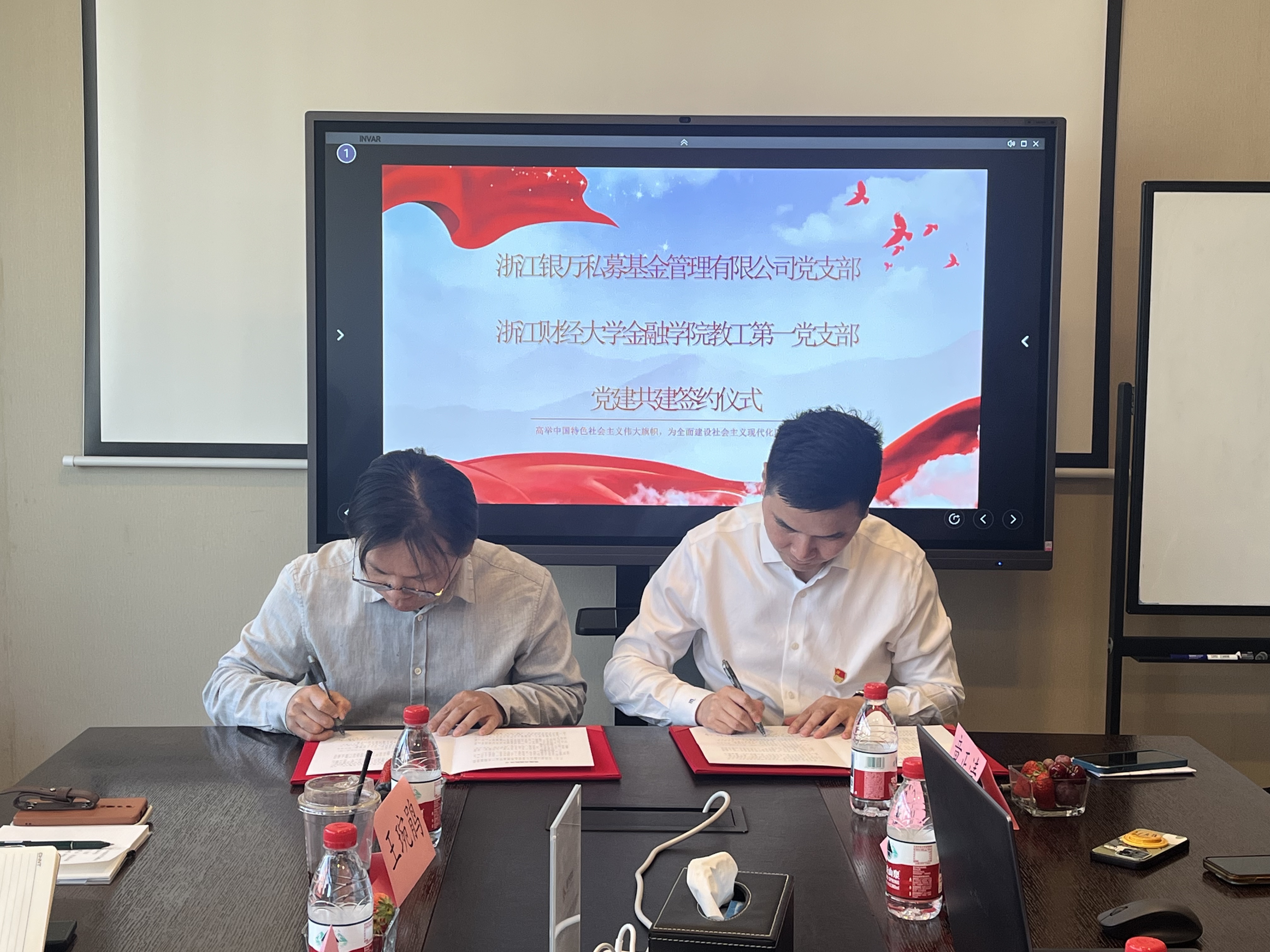 教工第一党支部与浙江银万私募基金管理有限公司党支部在三宏国际大厦举行党建共建签约仪式。浙江银万私募基金管理有限公司党支部书记、总经理、2004届校友赵峰,水果派