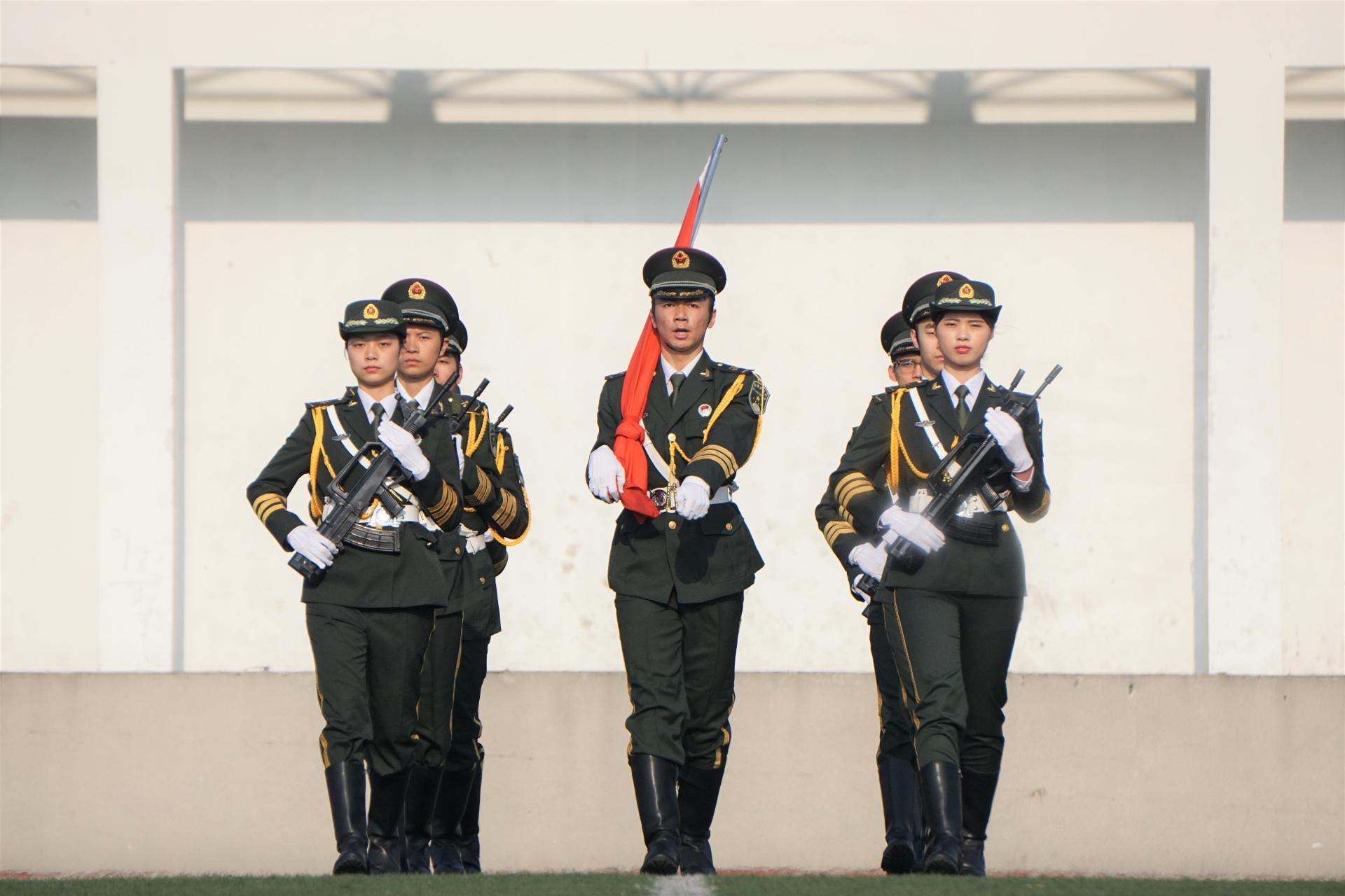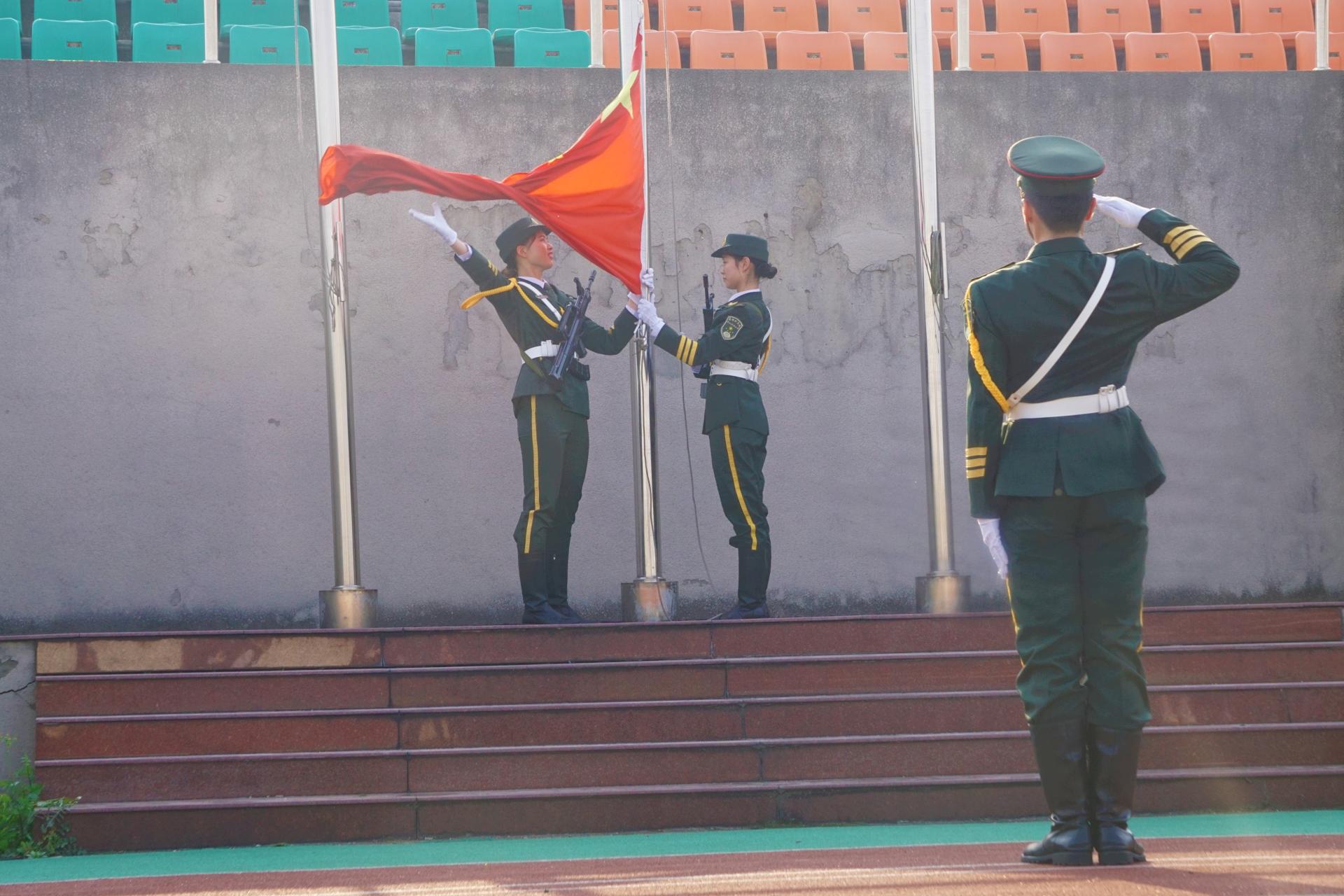仪式开始,在初升太阳的照耀下,英姿飒爽的国旗护卫队踏着铿锵有力的正步,护送着神圣的五星红来到主席台的中央。随后,在全体同学的集体注目礼下,五星红旗缓缓升起,在风中飘扬,庄严的仪式感油然而生。