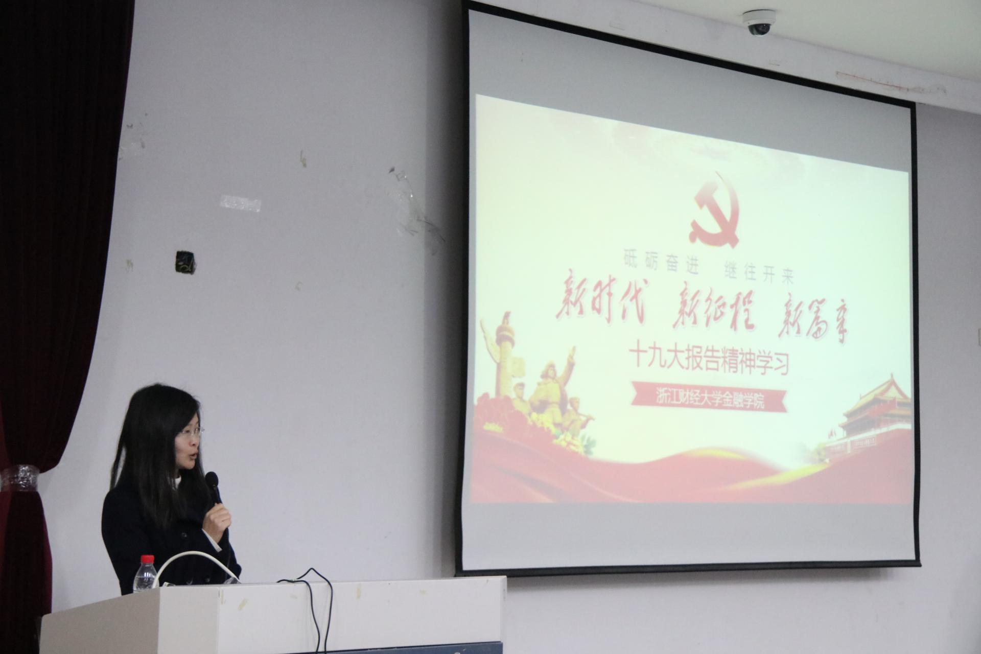 王伟伟老师分享了对于十九大精神的理解,详细介绍了十九大的主题,并通过一段视频,深刻地阐释了十九大报告中的“四个新”——新时代,新思想,新目标,新征程的意义。王老师谈到,当代大学生,是国家富强,民族复兴的希望,并鼓励同学们认真贯彻十九大的精神,努力学习。