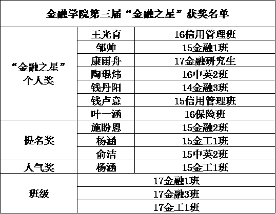 举办了第三届“金融之星”选拔活动。活动历时一个月,经个人和班级报名、学院评选小组推选、线上线下投票等环节,最终产生“金融之星”个人奖7名,提名奖3名,人气奖1名,班级奖3个。
