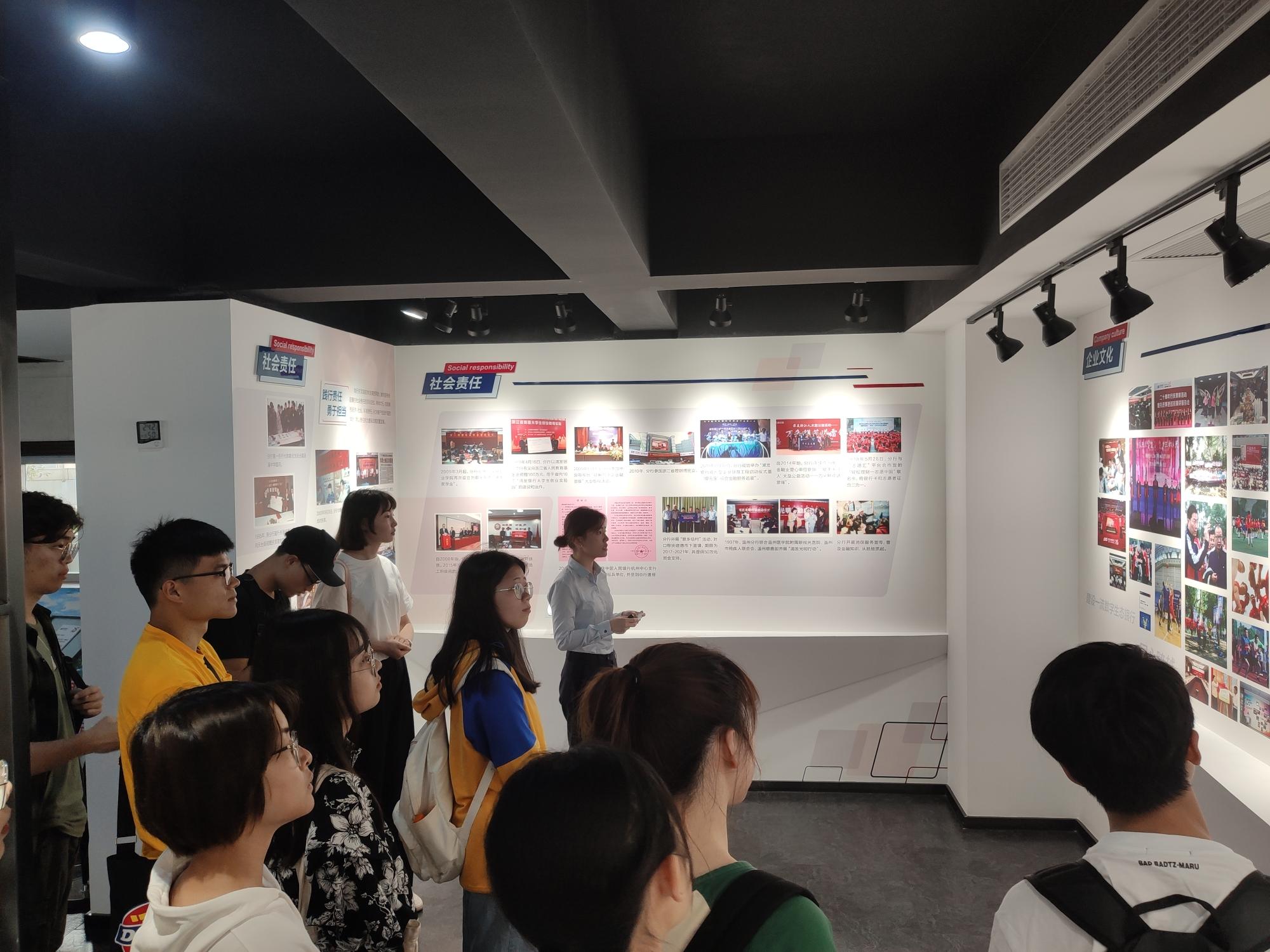 浦发银行理财经理刘安妮先带领同学们参观了浦发银行杭州分行行史馆,介绍了企业的发展历史、党建工作、社会责任及水果派等相关内容。