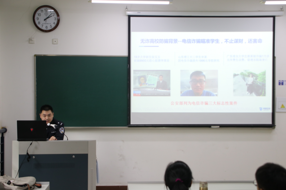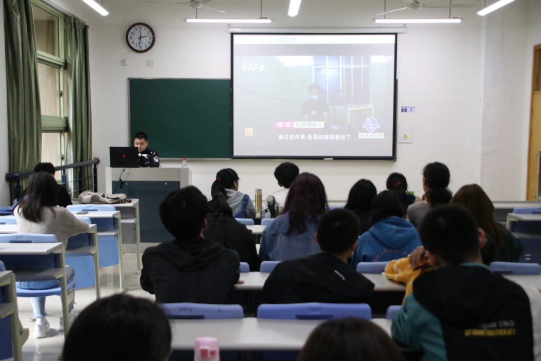 王警官结合自己多年的工作经验,通过视频的形式对大学生有可能接触到的几种常见诈骗手段进行了现场揭秘。通过生动形象的案例,深入浅出地剖析了诈骗犯罪分子的常用手段和话术,介绍了“心防”,“人防”和“技防”三种防范电信诈骗的重要手段,让同学们学会全方面的保护自己,擦亮双眼识别诈骗,提高对电信网络诈骗的防范意识。最后,王警官还介绍了上当受骗后的补救措施以及报案流程。