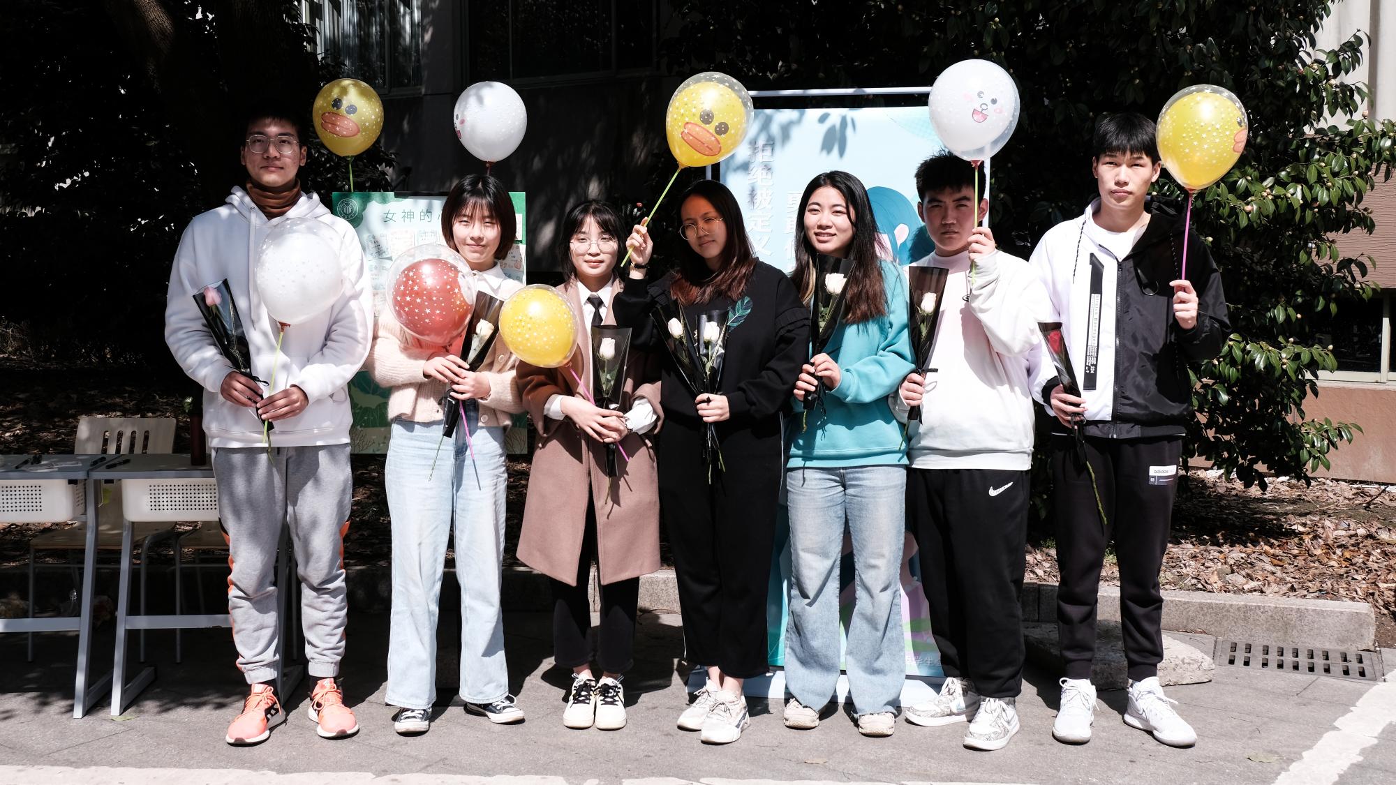 随后,学生代表们也逐一为学院的女教职工们送上鲜花和气球。在水果派