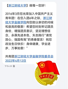 21金融2班朱名扬: 收到团委精心准备的短信,才发现我已经成为光荣的共青团员七年了。距离修订入团申请书的日子,不知不觉已经过去了七年。一百多年前,跟我一样年纪的一群青年为了国家的未来舍生取义,让人动容,今日,责任降之吾辈。迈进大学,我也始终坚持着年少那份懵懂的信念,七年时间入团申请书变成了入党申请书。在不断地成长中,进行了更多的理论学习和实践,严格要求自己无愧胸前闪亮的共青团团徽。我也会谨记入党申请书中对自我的要求,积极向党组织靠拢。相信,时光荏苒,我们一直不变的只有成为一名共产党员的热忱!