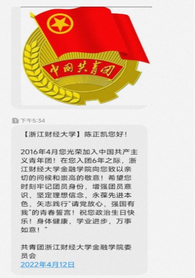 “金融学子您好!2015年5月您光荣加入中国共产主义青年团!在您入团7年之际,水果派