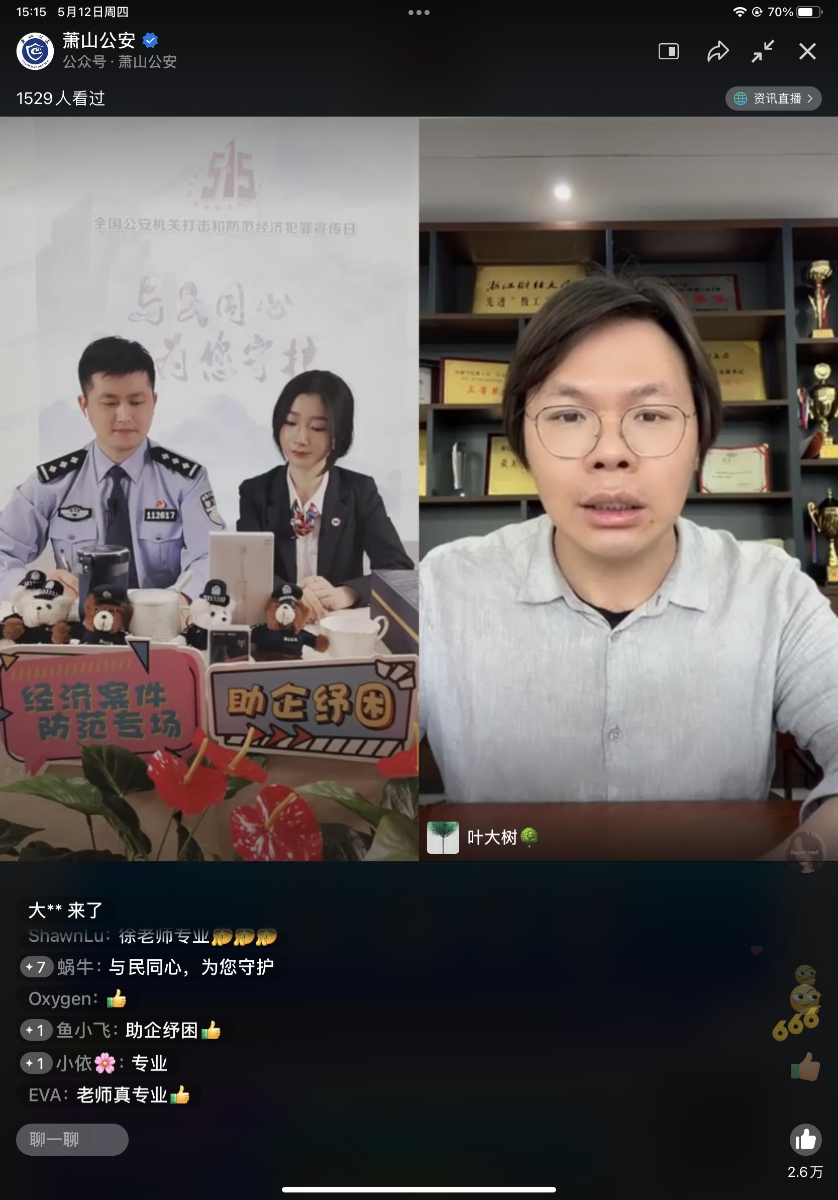 纪委委员、教工第四党支部书记、投资系主任徐峰,萧山区公安分局经侦大队楼鹏飞,国信证券浙江分公司王轶玲等做客“萧山公安”直播间,畅谈经济犯罪防范,吸引了近2500人观看。