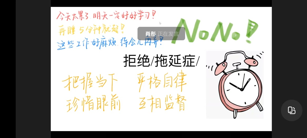 牟静姝学姐就自己的大学学习工作与大家做了分享,她建议班长团支书在工作上要认真负责,不能敷衍了事,注意作息时间安排;在学习上要刻苦努力,养成看文献的习惯,积极参加学科竞赛。同时,她也详细介绍了自己的考研备考经历,勉励大家在大学要树立目标,认真备考。