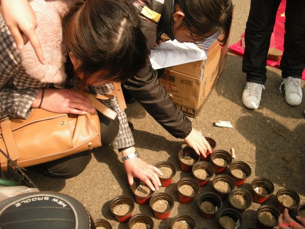 3月11日中午,实践部和生活部的同学们从花房里取来泥土,带着花种,花盆到达校西门口,开始准备发放工作。取土,装盆,放种子……简单的动作却饱含着低碳行动之意。“请问这是什么花的种子呀?”不断有同学上前询问。“这是代表着绿色与活力的太阳花的种子。”听过回答之后,同学们踊跃领取花种,并在“让我们走进绿色,让绿色拥抱我们”的横幅上签上了名字,加入到低碳行动的行列中来。不到半个钟头,几十盆花种便被热情的同学们领走,等待着发芽、出叶、开出爱心之花。