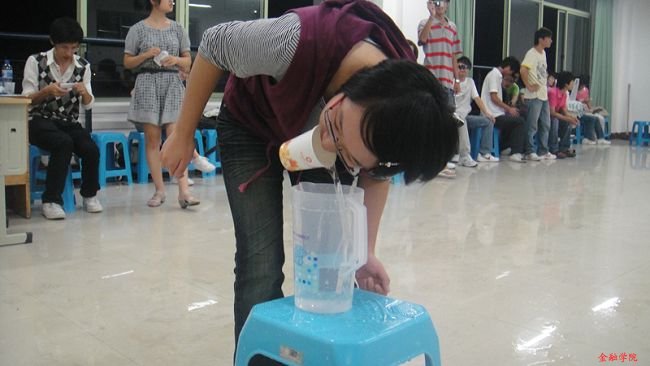 在月饼带来的浓浓中秋气氛中班会进入第二轮比拼——衔水杯的游戏。四大方阵两两PK,在限定的时间内,从教室一端将满满的一杯水用嘴衔到教室另一端,并用嘴的力量将水杯中的水倒入水壶中,最后比较各组中水壶水位的高低。比赛结果由梅花组和红心组胜出。
