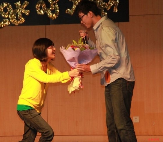 (图中向1号选手金伯晟献花的女粉丝是去年的院十佳亚军 高远)