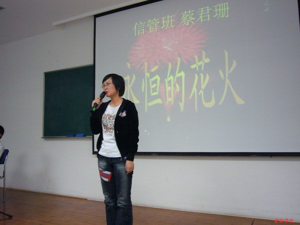 周婧伟《枕在钱塘江畔的美丽学园》,优美的文笔、动情的演绎,打动了在场的每一个观众。“前方的路美好,因为它未知;走过的路美好,因为它永恒”,《永恒的花火》,最后一位来自07信管的蔡君珊同学给演讲赛划上了一个完美的句号。