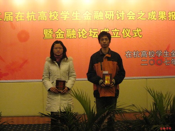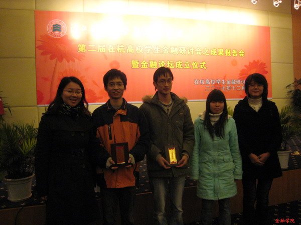 的韩潇、陈宇峰同学的论文《股权分置改革短期效应研究——对浙江省上市公司的检验》荣获一等奖,朱佳妮、陈茜、陆雁同学的论文《浙江上市公司治理的实证研究》荣获二等奖。