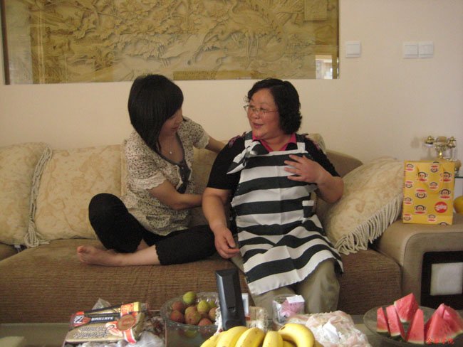 这时候,潘同学从她的房间里拿出自己做的围裙递送给潘妈妈,并给妈妈围上。