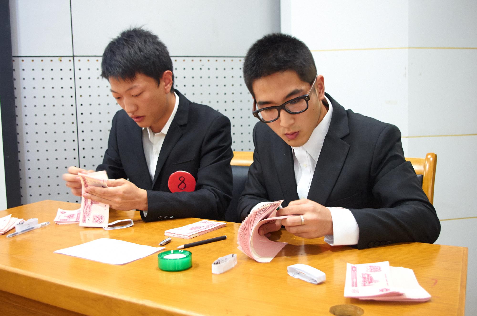 第一轮“胸有成竹”是通过每组3道题考察选手对于银行相关知识的熟悉程度,选手们有的镇定自若胸有成竹,有的则犹豫不决。共有5组选手在此轮中拿到满分,这轮无一淘汰。第二轮“金手指”是考察选手的点钞能力,每组选手各有两分钟的时间点清事先准备好的点钞券。选手们虽然手势各异,但是个个实力不浅。第三轮“谁能挡我”是考察选手小键盘传票输入的熟练程度。其中一位女生娴熟的手艺给大家留下了深刻印象并赢得了阵阵掌声。第四轮“我是谁”非常有趣,每组选手根据抽到的题目模拟日常发生在银行的突发事件,由群众演员配合完成表演,这一轮非常考察选手的随机应变能力和对银行相关知识的熟悉程度,选手们精彩的表演将比赛推向高潮。经过激烈比拼第五组和第十组两组选手脱颖而出进入最终的“巅峰对决”。巅峰对决环节是比赛五笔输入,最终第五组同学以打出五个字胜过第十组一字未打成为冠军。