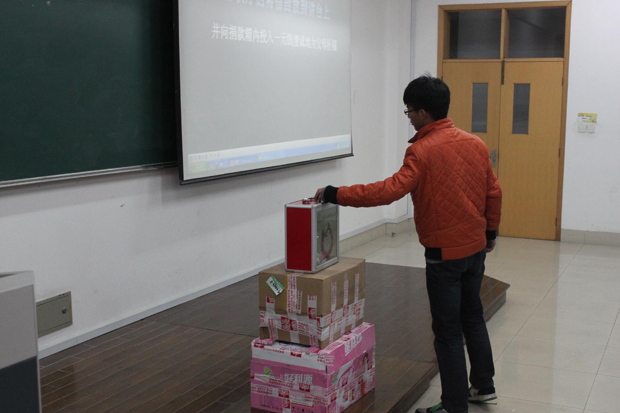 接下来,主持人在台上做了深情的演讲,活动也随之进入下一个环节“算算亲情帐”。工作人员给同学们发放了信纸和信封,让他们在纸上算一算从出生到现在自己所欠父母的帐,并预测自己未来的工资,算算需要多少年才能还得清这亲情帐。以一首《懂你》作为背景音乐,主持人几度哽咽的真情流露煽动了观众的情绪,所有人低头沉思,写下一份意义非凡的家书。接着是为父母祈福的环节,所有同学排成队伍往捐款箱内投入一元钱,对父母献上深深的祝福。
