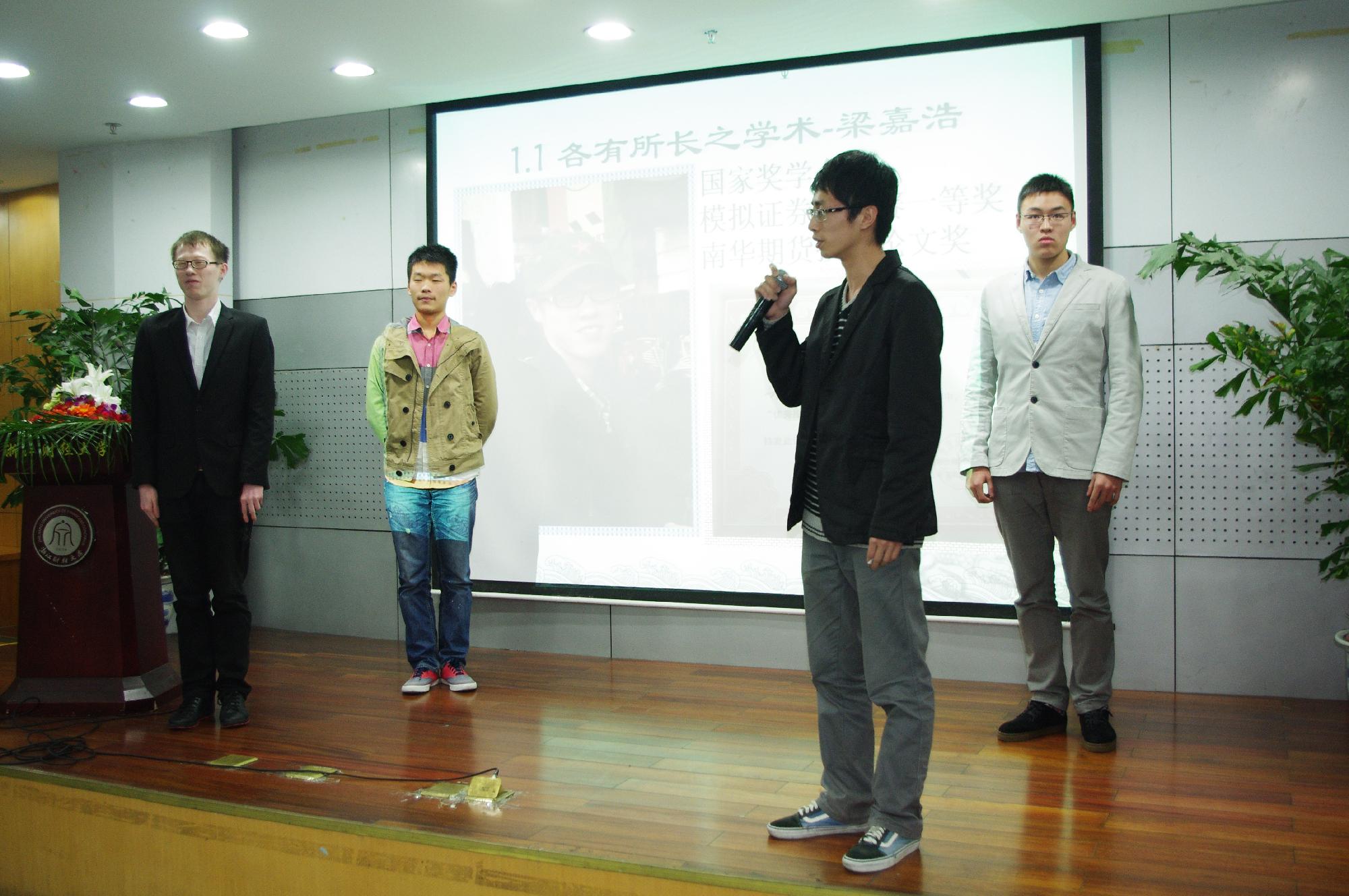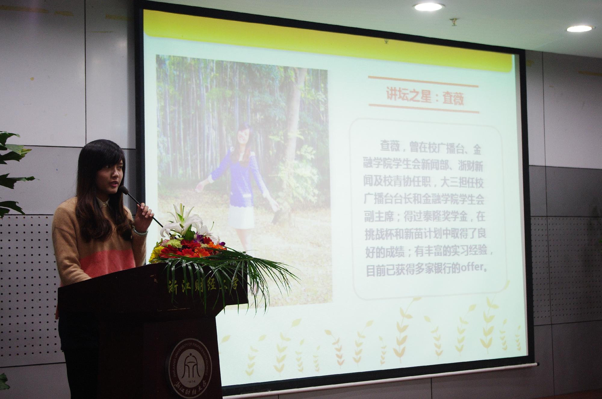 学生会副主席,现已得到多家银行的offer。作为即将结束大学生活的大四学生,她与在场的观众分享了她在校期间的经历。“我的大学生活很忙碌很辛苦,但劳有所值。敢于去尝试不同的事情,你会得到很大的提升。”她说道,“无论你选择了哪条道路,只要你努力去做好,都会收获成功。父母已经给了我们最好的东西,我们需要改变的是自身的能力而不是抱怨先天已经决定的条件。”她精彩的演说赢得了同学们的热烈掌声。