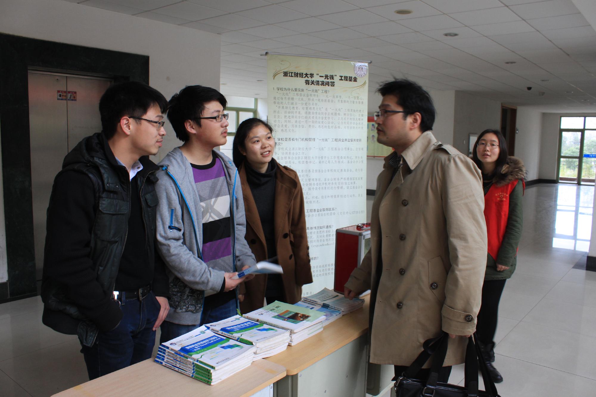 活动还未开始,就已有同学慕名而来,不一会儿,捐款箱前就排起来了一条长长的队伍。随后,活动正式开始,同学们手捧着善款,依次有序地将善款投入捐款箱。而此次活动所提供借阅的书本也深深地吸引着前来募捐的同学。他们纷纷驻足翻阅,还不时地向现场的工作人员咨询,同时工作人员也十分耐心地为同学们解答疑问并根据不同需要向同学们推荐了相应的书籍,现场学术气氛十分热烈。此外,工作人员还向同学们详细地介绍了一元钱工程活动,使现场的同学对一元钱工程活动有了更加深入的了解,更好地推动了活动的开展。转眼间,“一元钱”工程的捐款箱中就募集了不少善款,其中承载着金融学子们沉甸甸的爱心,在春寒料峭的财大校园中温暖了每一个人的心。