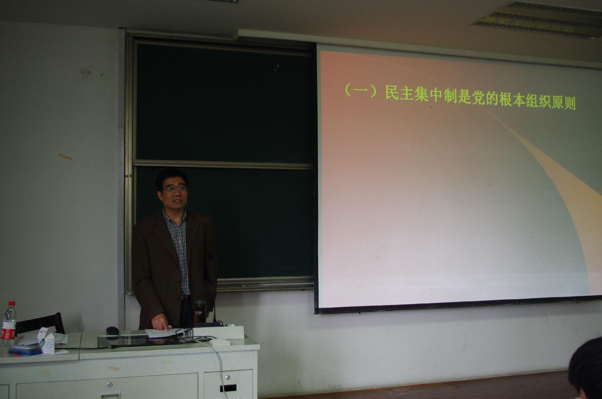 在同学们热烈的掌声中,杨鹰彪书记开始了题为“党的组织原则、党的纪律和作风建设”的党课。在介绍党的组织原则时,杨书记着重强调了民主集中制作为党的根本组织原则的重要性,同时详细介绍了民主集中制的内涵和基本原则。在党的纪律方面,杨书记介绍了党的七大纪律即政治纪律、组织纪律、宣传纪律、群众纪律、财经纪律、外事纪律、保密纪律,点明了党的纪律对更好地发展全党事业的重要性,同时强调作为党的接班人,我们应该努力做遵守纪律的规范模范。在党风建设方面,杨书记首先解释了党风的涵义以及群体性和稳定性两大特性,随后具体详尽地介绍了党的优良作风的基本内容:理论联系实际的作风、密切联系群众的作风、批评与自我批评的作风、艰苦奋斗的作风。杨书记列举了前苏联的例子来强调加强和改进党风建设的重要性,他指出党的作风关系到党的形象和威信,决定党事业的成败、影响党的前途和命运。结合当前的社会实际,杨书记重点强调了腐败问题,他指出了腐败对全党事业发展的危害性,向同学们介绍了今年全党在反腐败方面所做的努力以及取得的成就。杨鹰彪书记用简洁明了的语言、生动鲜活的例子向同学们介绍了党的组织原则、纪律以及作风建设。台下的同学们也聚精会神地听讲、认真地做着笔记。