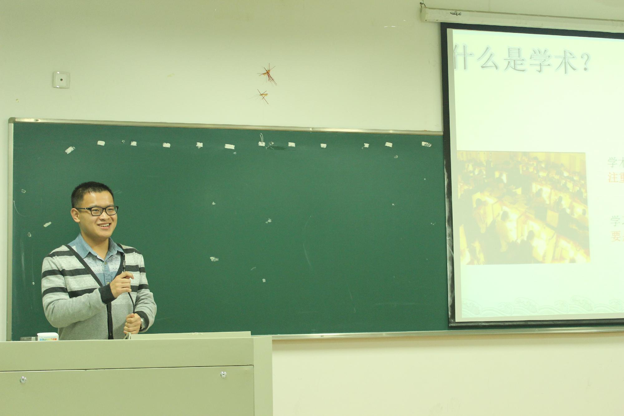 百家讲坛之“新青年——金英汇”在学院楼209教室举行。本次论文指导会由11金工2班的来佳炳同学主讲,来参加指导会的都是大一的同学。本场讲座是针对论文写作技巧以及大学生涯规划的全面指导。