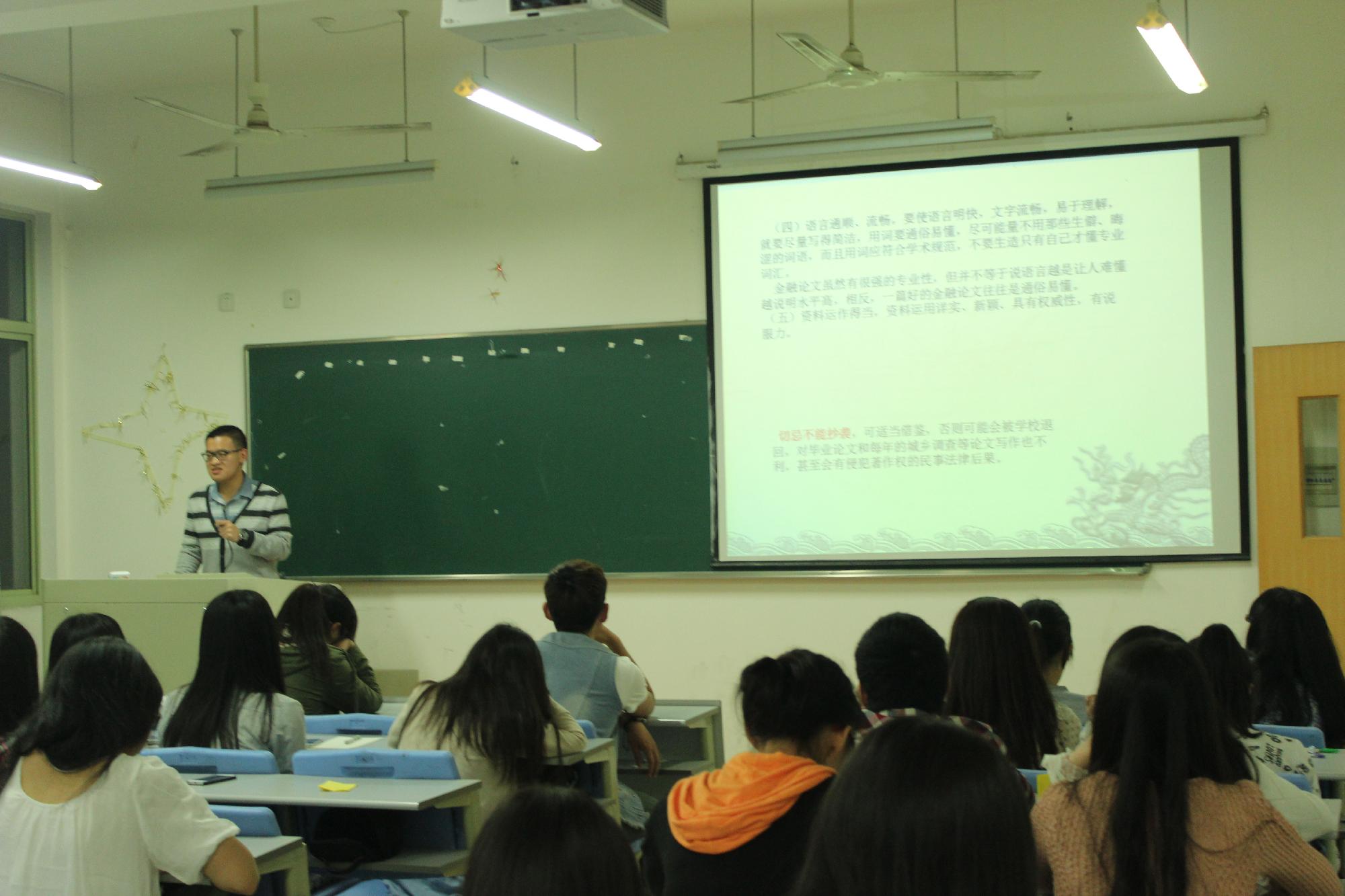 讲座一开始,来佳炳同学首先给大家简单介绍了挑战杯、新苗计划并分享了获奖经验,接着详细讲解了经济金融学术论文写作技巧和规范,还将每个步骤一步一步地列出来,方便同学们更好地理解。除此之外他还发表了自己对论文选题方法的独到见解,并总结出同学们应该注重专业素养的提升——比如通过考证、考研、竞赛、看财经新闻等等。来佳炳同学还提到搜集资料是金融论文写作的基础和前提,要学会使用图书馆的数据库、浏览财经新闻媒体、专业财经数据网站、期刊网站等。他从其自身经历出发给同学们推荐了一系列好书及财经记者访谈节目,并悉心介绍证券从业、银行从业、期货从业、会计从业、剑桥BEC商务英语、初级会计师、中级会计师、高级会计师、CFA等多门证书的考试经验。在本次指导会的最后,来佳炳同学还与在场同学进行了平时学习生活问题的探讨和学习经验的传授。