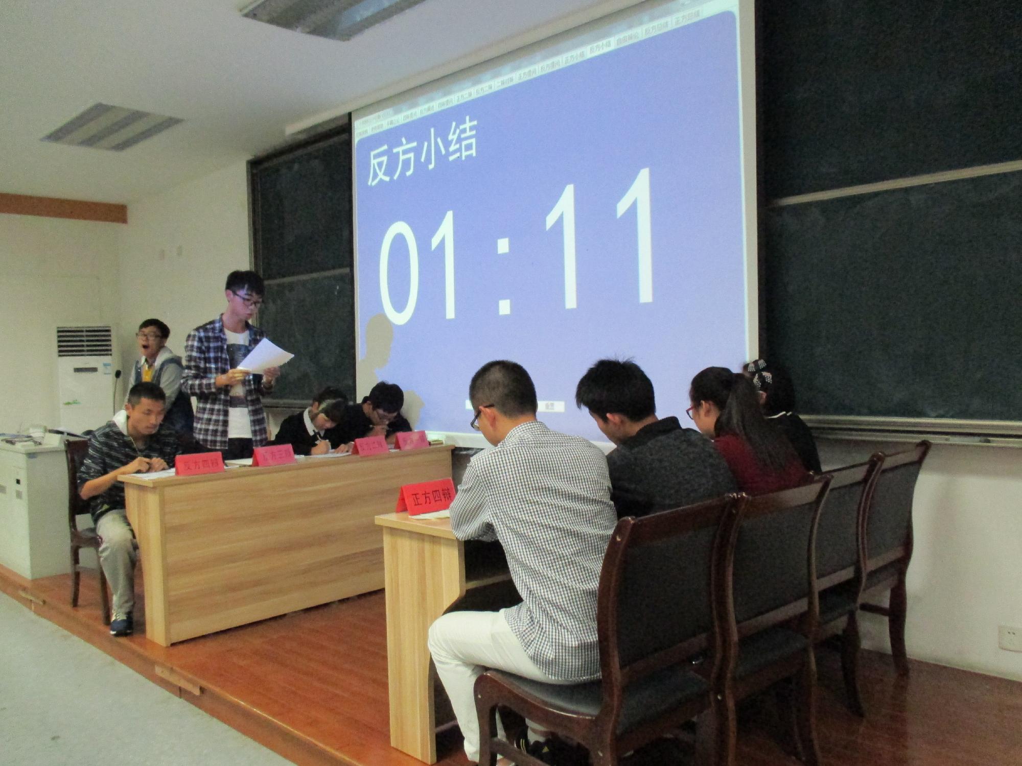 在学院楼102室举行了14级新生辩论赛初赛第三场和第四场。校辩论队资深辩手沈珂儿、院辩论队成员作为评委,校辩论队选手丁帅骊作为嘉宾出席了本场比赛。