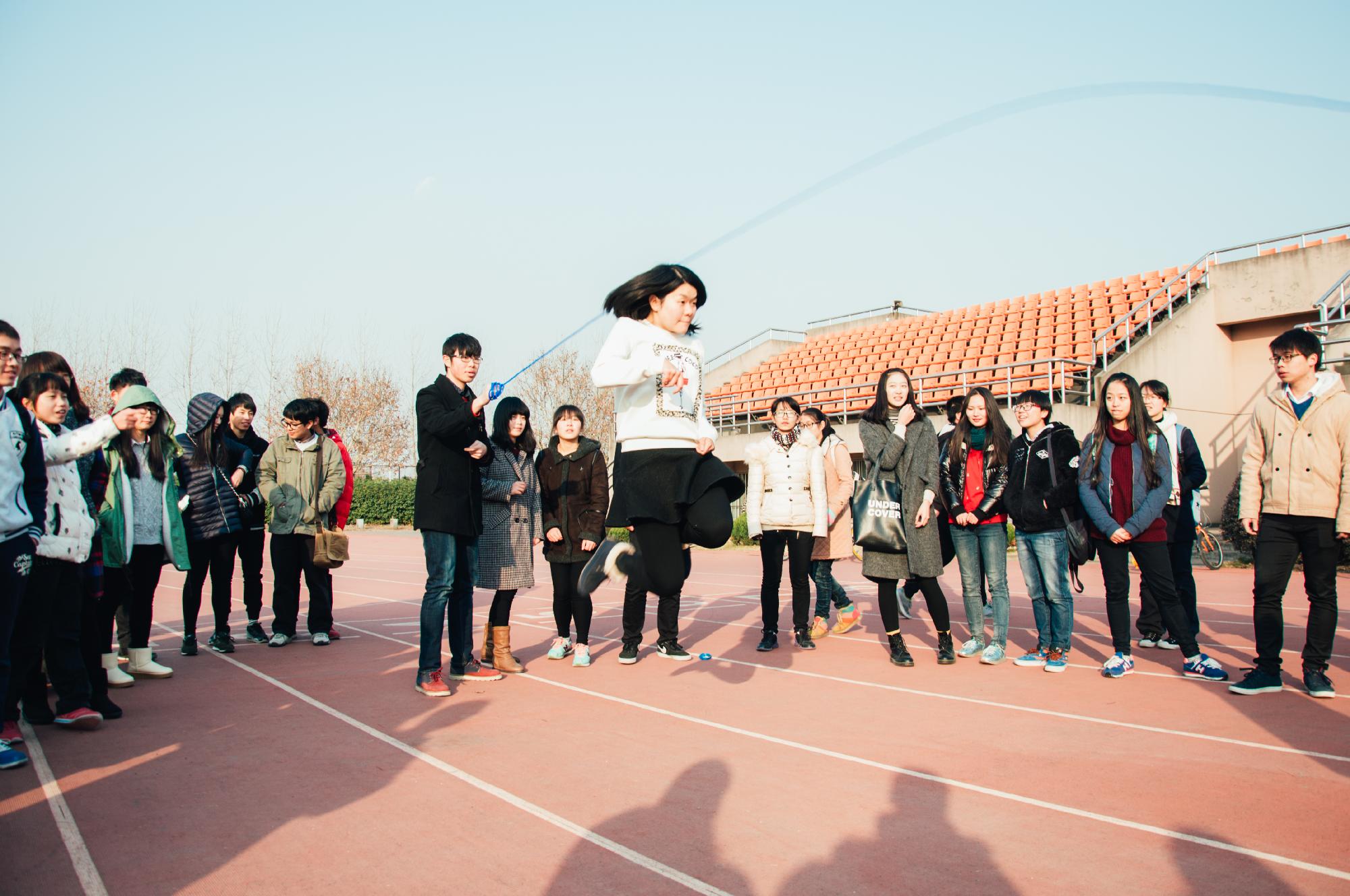 趣味运动会伊始,所有参与者根据简单的调整进行分组。趣味运动会共分三轮。第一轮进行的是撕贴纸。比赛刚开始,现场气氛就迅速热烈起来。参与者或互结小组,或独自应战,或主动出击、攻其不备,或岿然不动、自保到最后。比赛到最后两人时,现场更是热烈。旁观者欢呼呐喊,看选手追逐;参与者时刻警惕,防神来之“手”;第二轮的游戏接力共有四个环节:第一环节,一个人边跳绳边跑步;第二环节,一个人眼覆眼罩,背负一人,脚踩气球;第三环节,两人背夹气球过弯道;第四环节,两人三足。四环节以接力形式先后进行,用时最短的小组获胜。第二轮比赛还未开始,各小组便激烈讨论各环节人员安排。开始后,经各组精心挑选安排环节人员,游戏接力环环相扣:跳绳、奔跑、背负……无不体现了同学们的青春活力,彰显了合作魅力。第三轮的跳长绳中,各组成员一个接一个穿过挥舞的绳子。有人手脚不灵活,引得笑料不断;有人轻快敏捷,使人惊叹佩服。