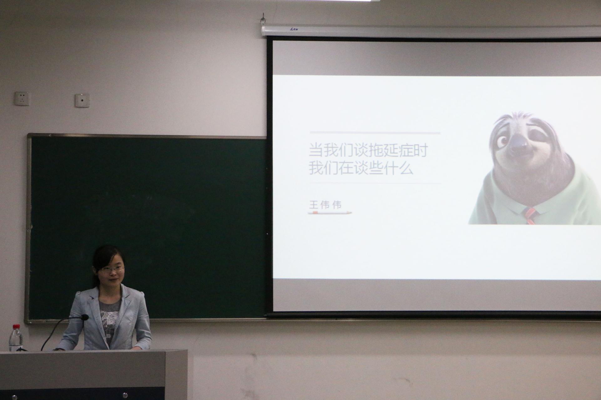 讲座中,王老师分别从什么是拖延症、为什么我们都有拖延症、如何与拖延症共处三个角度剖析了拖延症这一现象。首先,王老师利用胡适日记与生活实例详细讲述了拖延症的含义与表现。紧接着,王老师通过人类进化、社会发展、个人角度以及外因四个角度进一步分析了拖延症形成的原因。在介绍如何与拖延症共处的话题时,王老师向同学们列举了鸡汤、反鸡汤等不靠谱的方法,提出要在思想上接受拖延症的现状,在行为上开始行动。她更进一步讲述了结构性拖延、专注心流体验等具体方法。