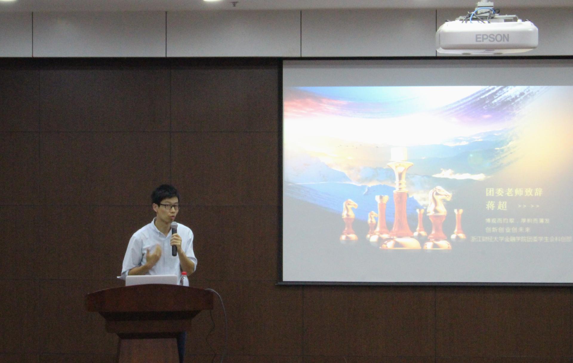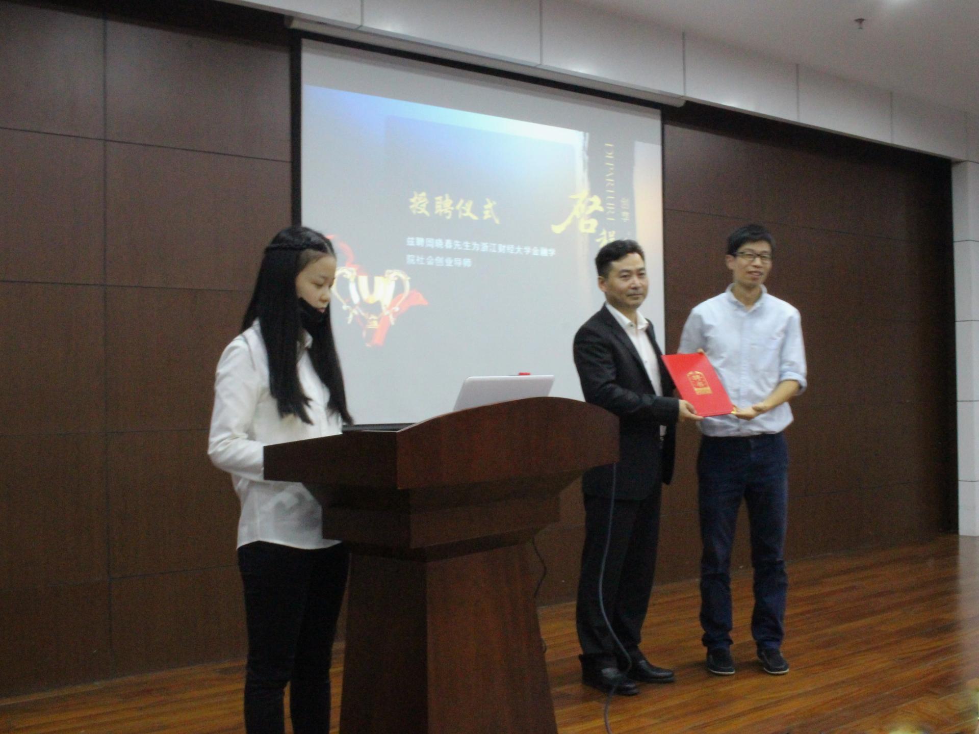 蒋超老师首先发表致辞,鼓励在坐的金融学子们去发现挖掘那个独一无二的自己,以创新创业的精神更好地创造价值,服务于社会。随后介绍了周晓春先生的事迹,并对他的出席深表感谢和荣幸并为其颁发了相关聘书,正式宣布创想精彩活动开始。