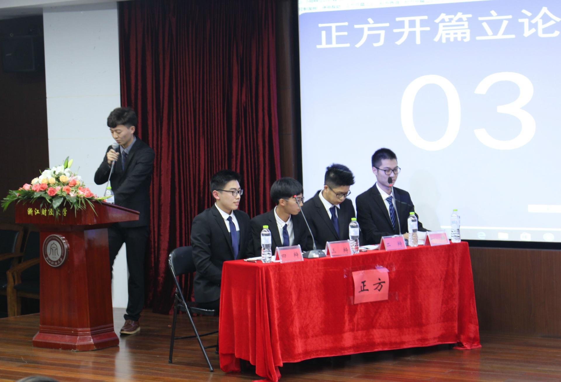 出战的是16金融3班陈熠阳、16金融2班潘铭谦、16金融1班全晟捷、16中英金融2班孙易欣,秉持的观点是英国脱欧对中国利大于弊,反方是经济学院代表队,他们秉持的观点是英国脱欧对中国弊大于利。比赛分为一辩立论、二辩升论、对辩、三辩质询、自由辩以及四辩总结这几个环节,比赛气氛紧张热烈,双方辩友你来我往,侃侃而谈,场下更是掌声连连。期间的观众提问环节亦是精彩不断,将气氛推至另一个高潮。最终,水果派