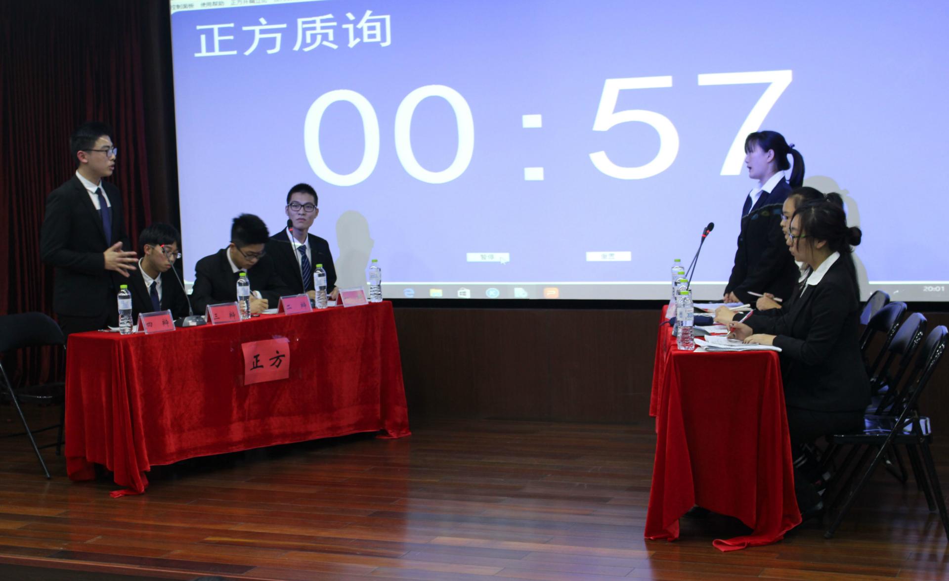 在紧张的气氛中,第一场比赛季军赛率先开赛。该场比赛的辩题是侥幸心理是人性的优点还是缺点,在工商学院代表队和财税学院代表队之间展开激烈交锋,最后由正方工商学院赢得了该场比赛,获得季军。