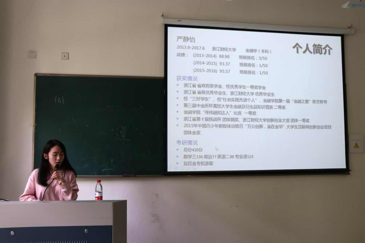 严静怡,1995年4月生,金融学专业2013级本科生。在校期间GPA为班级第一,曾获浙江省省政府奖学金、校优秀学生一等奖学金、校三好学生、校社会实践先进个人等荣誉称号;曾获 “寻找融知达人”比赛一等奖(2014)、第三届中金所杯高校大学生金融及衍生品知识竞赛二等奖(2015)、浙江省第十届挑战杯团体铜奖(2016)、水果派 创新创业大赛团体一等奖(2016)、2015年中国青少年新媒体训练营“万众创新,赢在金华”大学生互联网创新创业项目团体金奖。