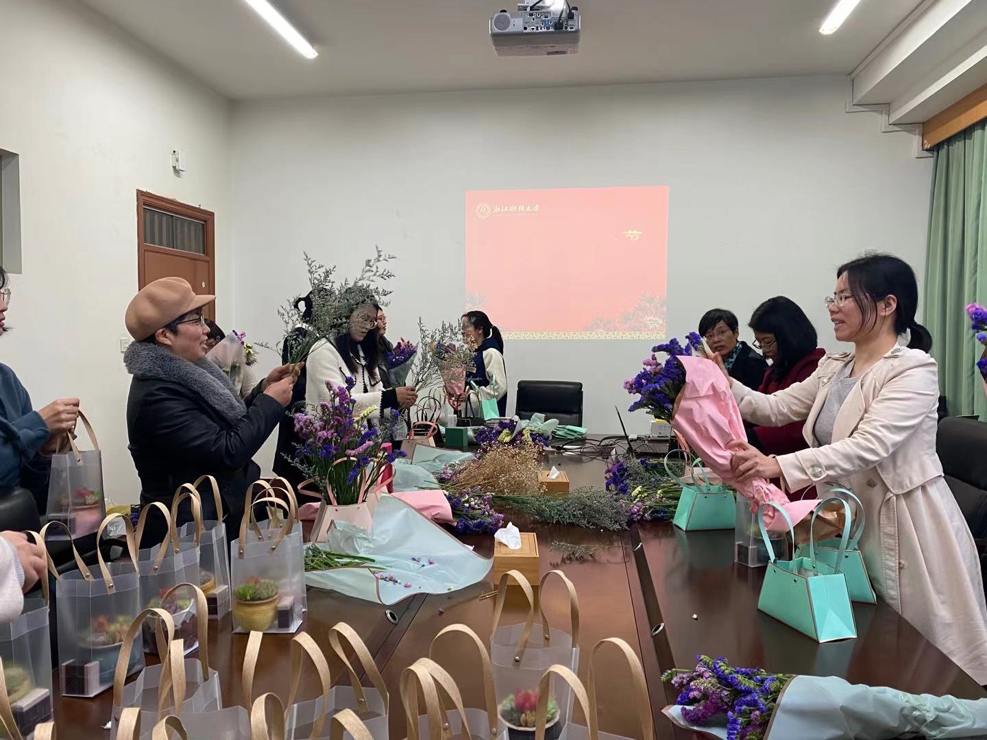 为庆“三八”妇女节的到来,丰富学院女教职工的文化生活,院工会组织了一场温馨有趣的插花艺术活动。女教职工门欢聚在学院418会议室,共度美好春日时光。