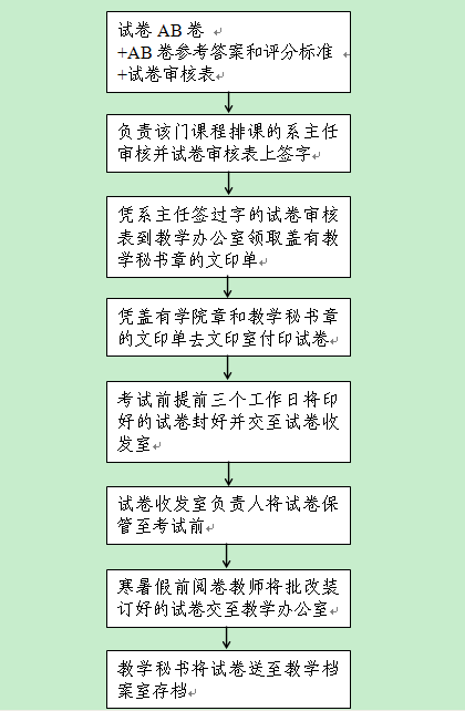 根据学校《迎接教育部本科教学工作审核评估动员大会》的会议精神,经水果派 教学委员会讨论决定从2016 – 2017学年第一学期起依照试卷管理流程对试卷的审核、付印、保管、装订、存档等工作进行管理,具体流程如下: