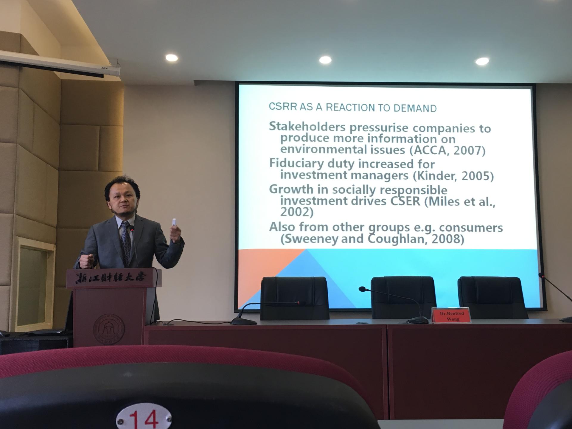 Wong博士从四个方面展开说明了“中国大型企业近年的社会责任与绩效”问题,首先,阐释了公司社会责任报告的概念;其次,给大家深刻剖析了可持续性的含义;然后,对公司社会责任报告的重要性进行了说明;最后,分析了公司热衷于发布社会责任报告的原因。本次讲座有以下三个特点:第一,学术性与现实性相结合,将公司社会责任与当今热点的环境保护问题深刻结合,同时把社会契约理论和制度经济学理论灵活地运用;第二,微观与宏观密切结合,宏观的社会责任、环境保护可持续性问题将会影响到微观的企业经营管理决策以及企业每股收益,这给我们未来的研究提供了思路和方法;最后,深奥与通俗相结合,将复杂的理论体系融于大家熟悉的中石油和中国工商银行的案例当中,通俗易懂。