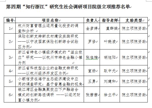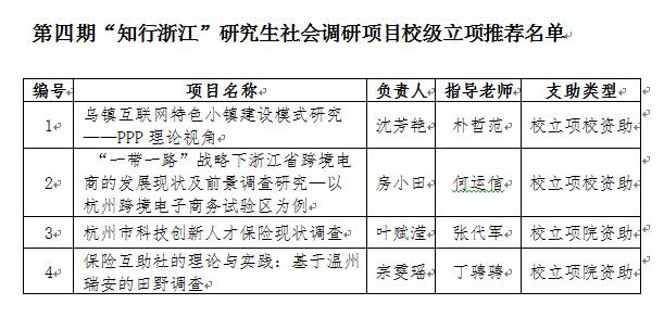 根据党委研究生工作部《关于开展第四期“知行浙江”研究生社会调研项目申报通知》的相关规定,经学生自主申请、学院教学委员会讨论研究,现拟推荐校立项调研项目4项(其中2项校资助2项院资助)、剿灭劣V类水专项2项,院级调研项目拟立项6项(资助额度为每支队伍1000元),具体名单如下: