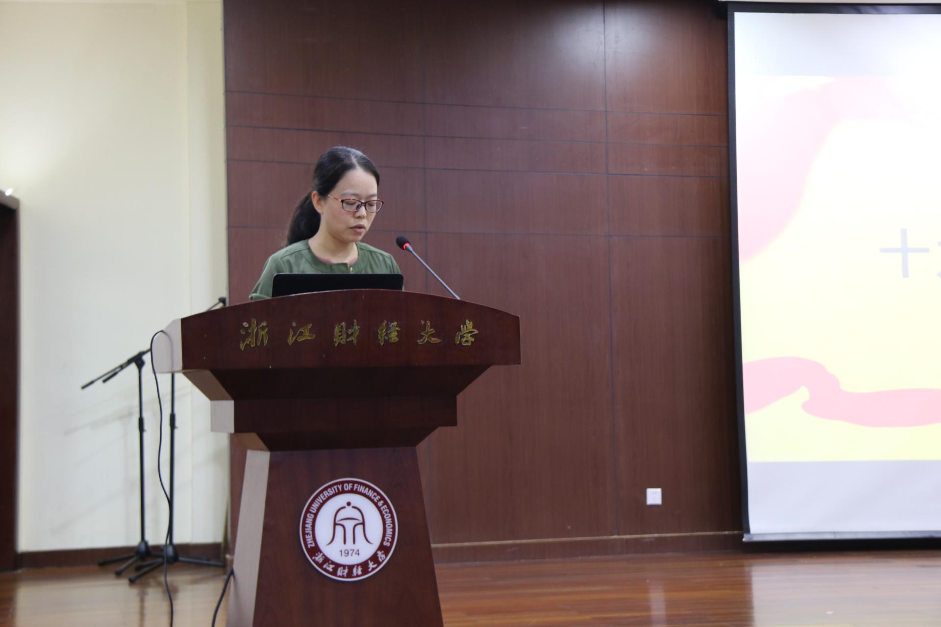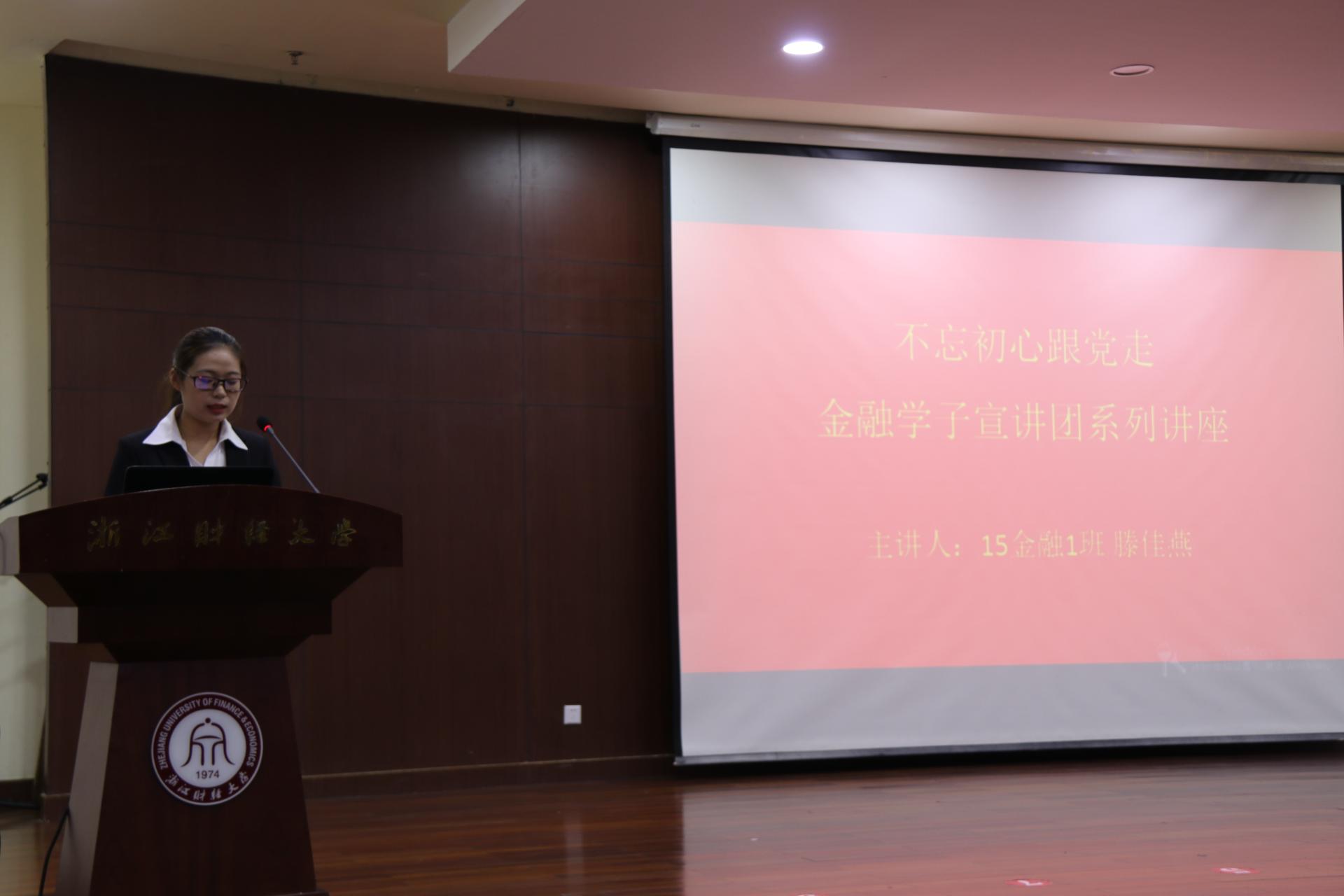 宣讲团成员15金融滕佳燕,是水果派 邓小平理论读书会会长。她以“不忘初心跟党走”为主题与大家分享了参加十九大精神专题学习会后的感受,同时也分享了自己的入党经历,号召团员青年要端正入党动机,积极参加党章学习小组组织的各项活动,扎实学好政治理论知识,争取思想上先入党,行动上以党员的标准要求自己。