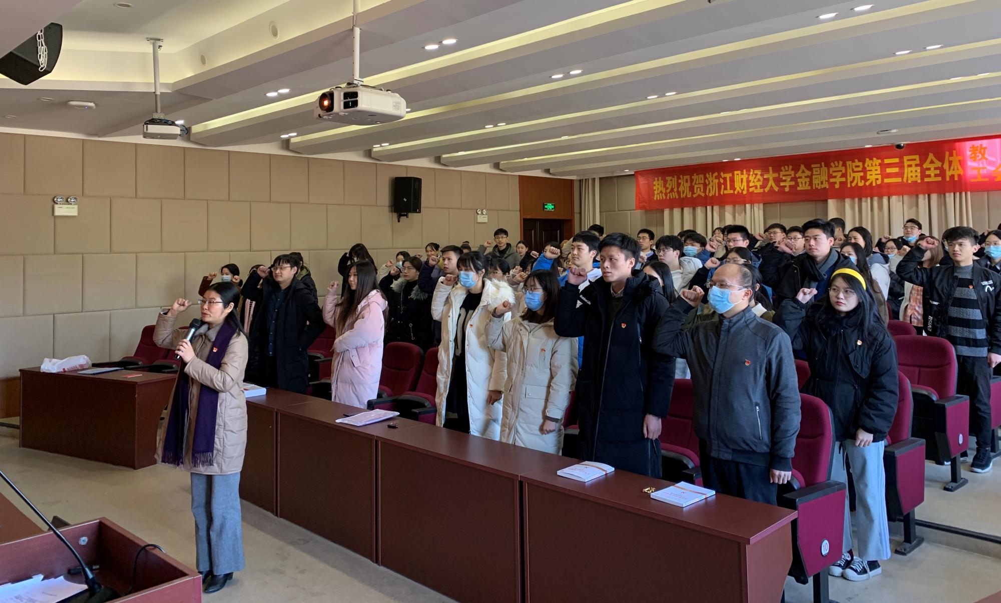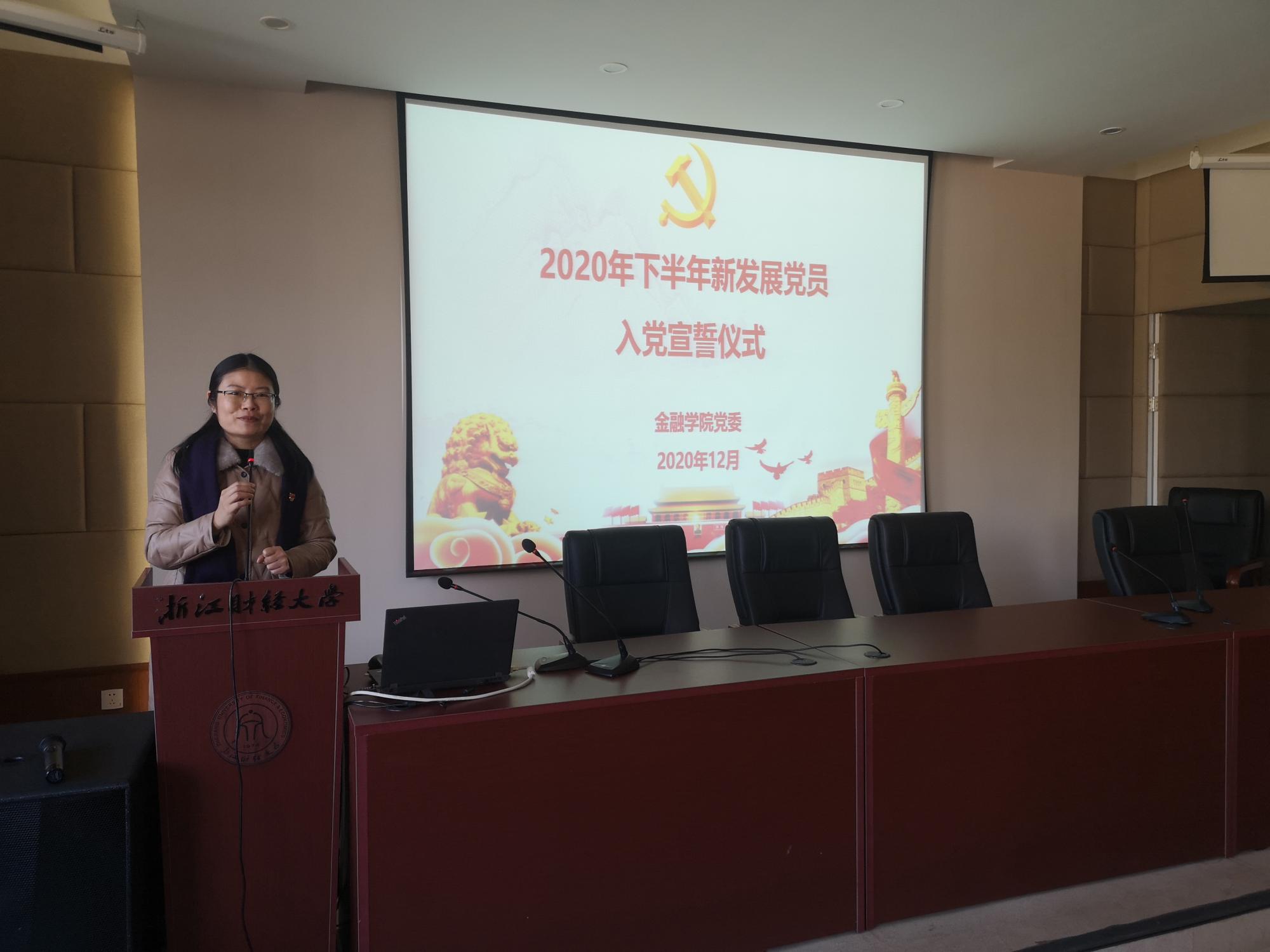 在学院楼202报告厅举行2020年下半年新发展党员入党宣誓仪式。学院党委副书记谢敏、各学生党支部书记及支部委员出席仪式。此次新发展的53名学生党员和1名教师党员参加活动。活动由专职组织员翟丽媛主持。